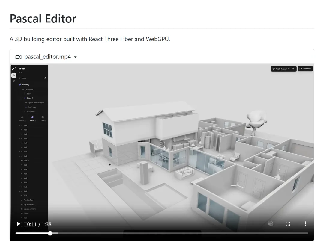 在建筑信息化(BIM)与 Web 3D 技术融合的大趋势下,一款名为 Pascal Editor 的开源项目正在 GitHub 上悄然走红。这款基于 React Three Fiber 和 WebGPU 技术构建的 3D 建筑编辑器,不仅为开发者提供了一套完整的建筑可视化解决方案,更展示了现代前端技术栈在复杂 3D 应用场景下的无限可能。