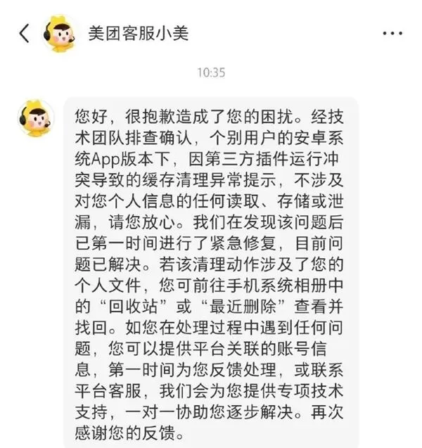 有用户表示,自己六年来积累的 504G 照片和视频因此永久丢失,且文件损坏无法恢复。针对这一严重的情况,美团客服给出了排查结果,称这是由于个别安卓系统版本下的第三方插件冲突导致的。