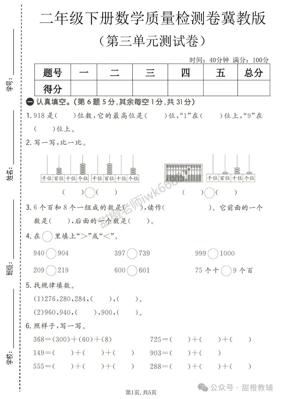 这份《冀教版》二年级(下)数学第三单元质量检测卷,严格依照冀教版教材第三单元知识点精心设计。全面覆盖该单元图形的运动等核心内容,题型丰富多样,有选择题、填空题、操作题等,既能考查孩子对基础知识的掌握,又能检测其知识运用与实践操作能力。通过模拟测试,能帮助孩子熟悉考试题型,明确学习薄弱点,以便有针对性地查缺补漏,提升数学学习水平。