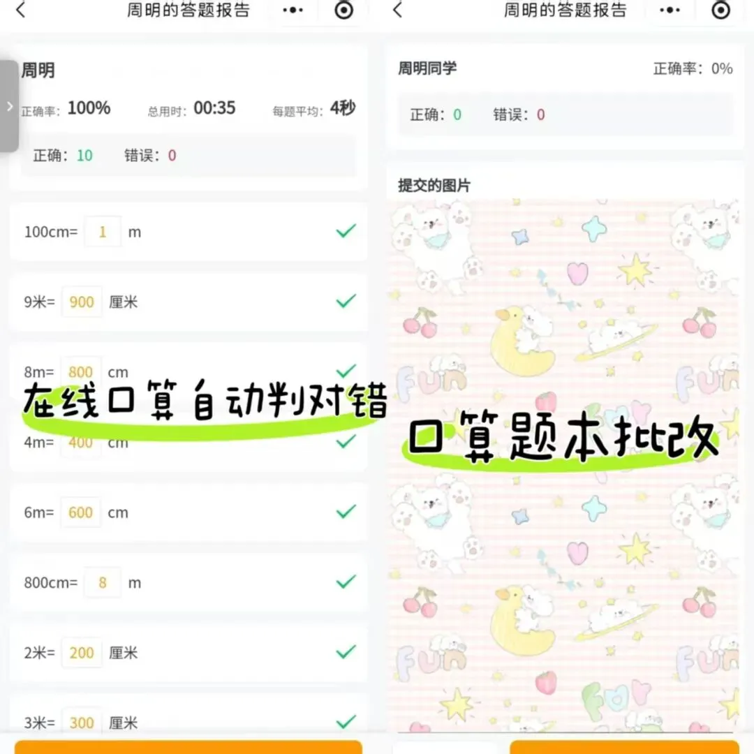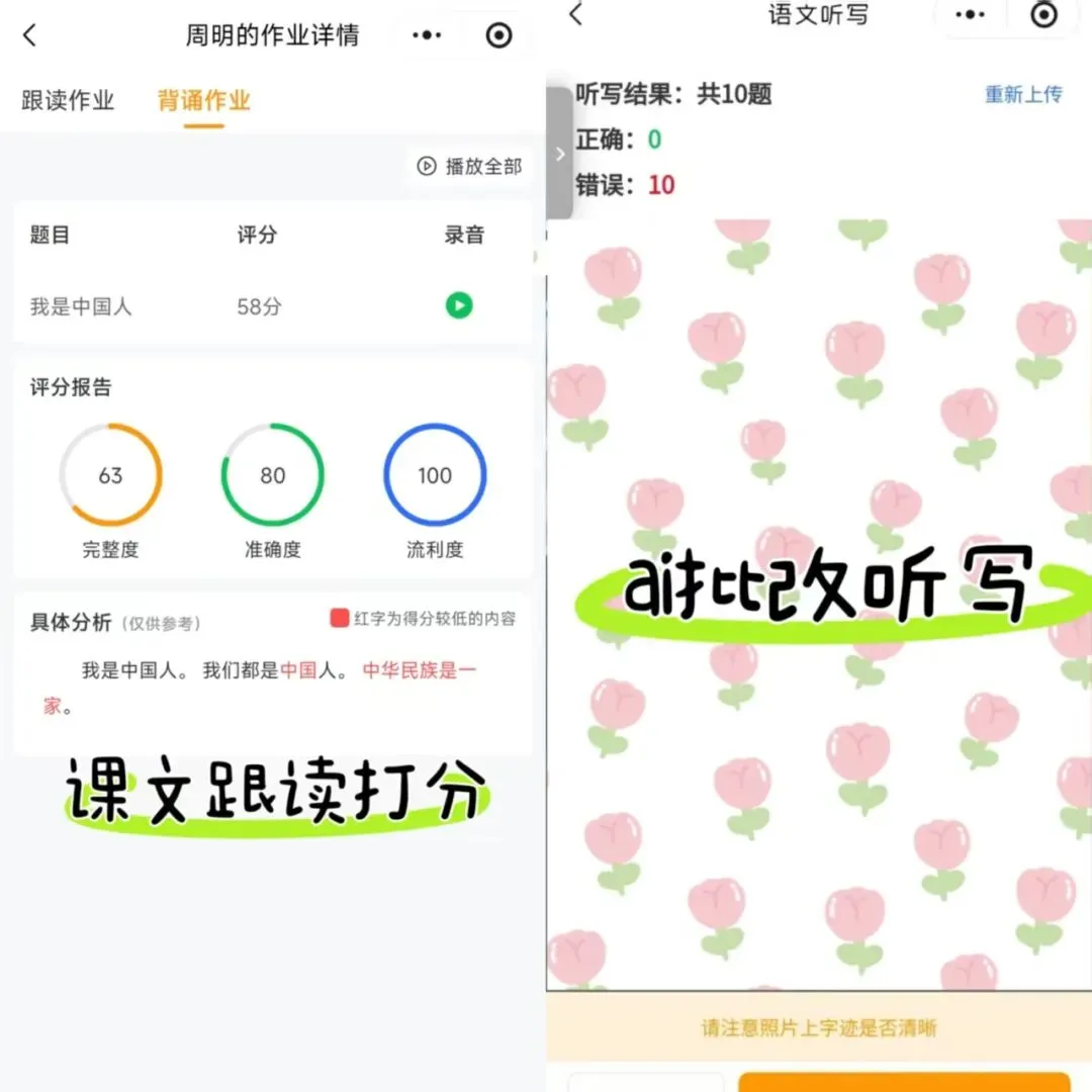 老师能一键发布语文英语的跟读、听写、背诵任务,系统自带标准发音示范,通过 AI 语音评价技术,从准确度、完整度、流利度三个维度给学生录音打分,哪里读错了标得明明白白,不用老师逐个听;数学口算练习支持按知识点自动出题,学生在线做或拍照上传手写答案,AI 3 秒就能改完,还能生成错题报告,哪个知识点弱一目了然。