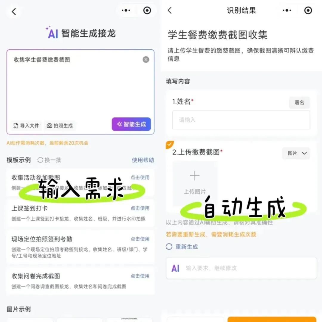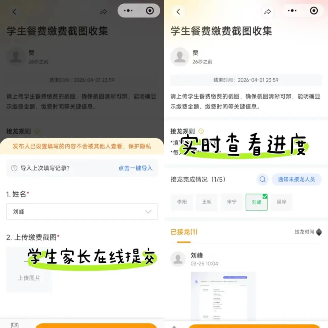 老师只要说需求(比如 “收学生餐费缴费截图”),AI 10 秒生成带所有字段的接龙页面,点一下就能发班级群。