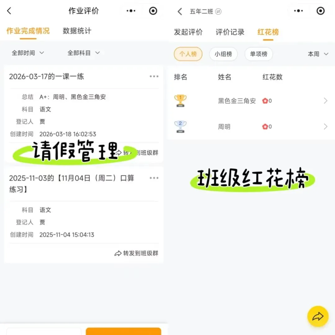 教育部备案,用着更安心除了上面这些,接龙管家还能快速发成绩、管请假、做学生评价,从幼儿园到高中老师都能用。