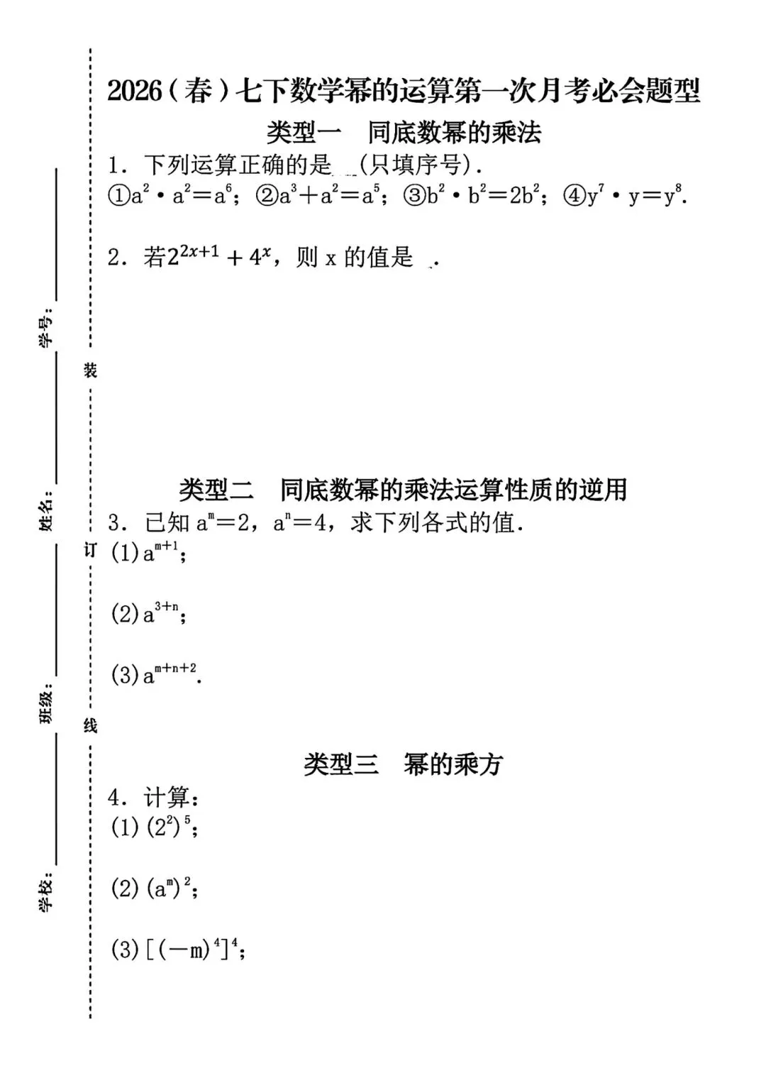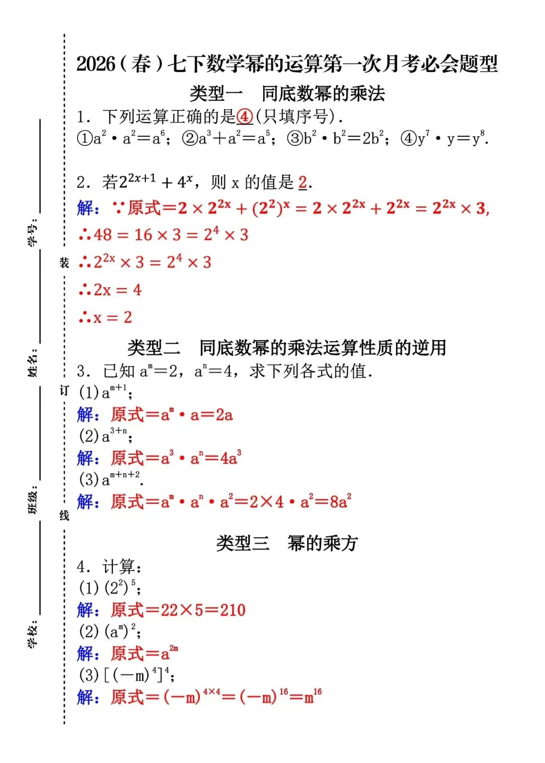 2026年春新版七年级下册北师大版数学第一次月考必考重点《幂的运算》必会7大题型含答案,完整高清电子版可打印