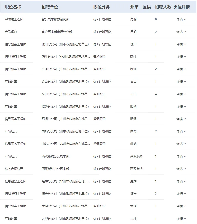 具体职位职责及要求见“云南移动招聘网站” (https://hire.ynydhlw.com)。