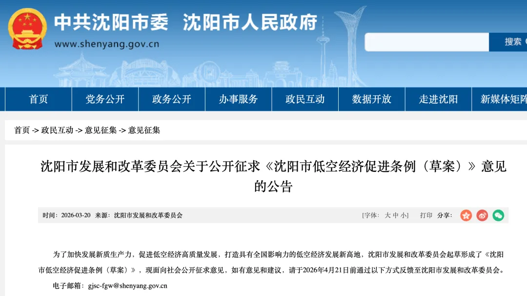 为了加快发展新质生产力,促进低空经济高质量发展,打造具有全国影响力的低空经济发展新高地,沈阳市发展和改革委员会起草形成了《沈阳市低空经济促进条例(草案)》,现面向社会公开征求意见,如有意见和建议,请于2026年4月21日前通过以下方式反馈至沈阳市发展和改革委员会。