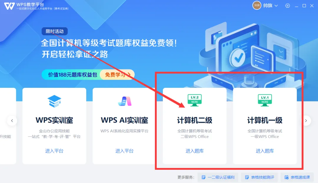 在客户端侧边栏找到“WPS教学平台”,进入后点击”计算机一二级题库”即可开启在线练习👇