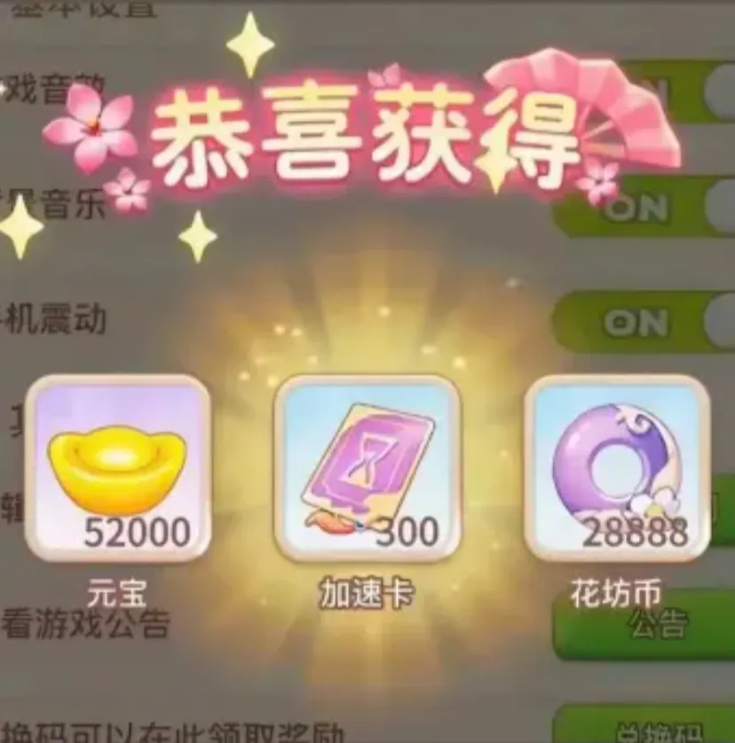 春信已至庭满花开:元宝×50 + 加速卡×10 + 花坊币×10