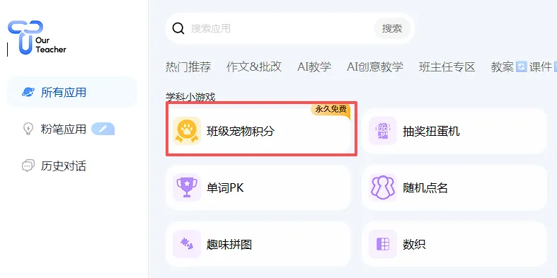 那么班级宠物积分系统我们怎么实现呢?在这里,大白兔老师也做了一些探究,将最简单且免费的课堂宠物积分系统分享给大家,那就是使用ourteacher平台自带的“班级宠物积分”功能。
