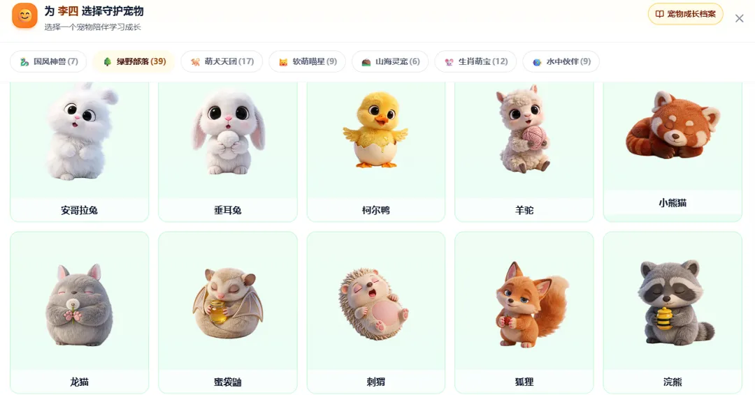 添加实例学生后,就会如下图所示,为孩子们选择领养宠物啦!