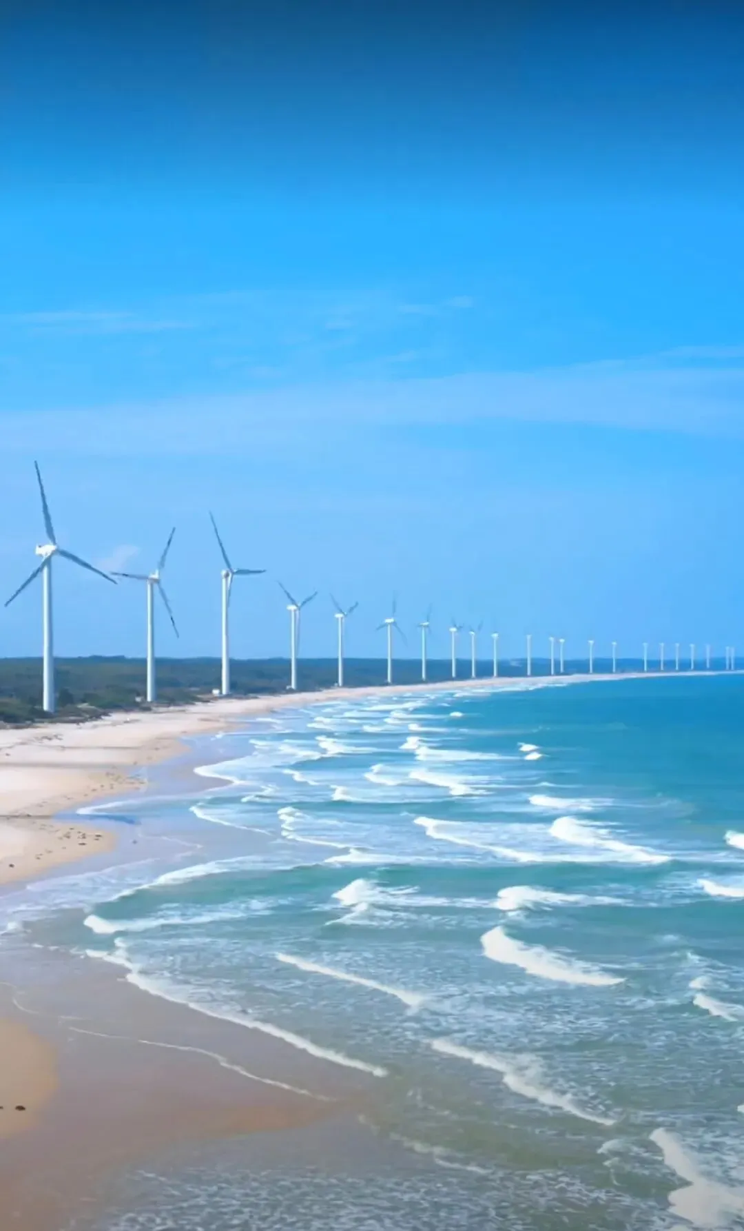 风车海岸位于文昌市铺前镇与锦山镇沿海,是海南环岛旅游公路上的标志性景观带。据资料介绍,这里原本分布着34台风力发电机,后来经过“以大代小”的增容改造,现在矗立着16台单机容量6.25兆瓦的抗台型风机。它们沿着海岸线绵延7公里,巨大的叶片在海风中缓缓转动,与蓝天、碧海、白沙共同构成了一幅极具工业美学的画卷。