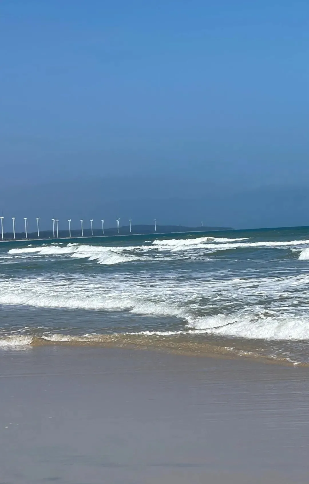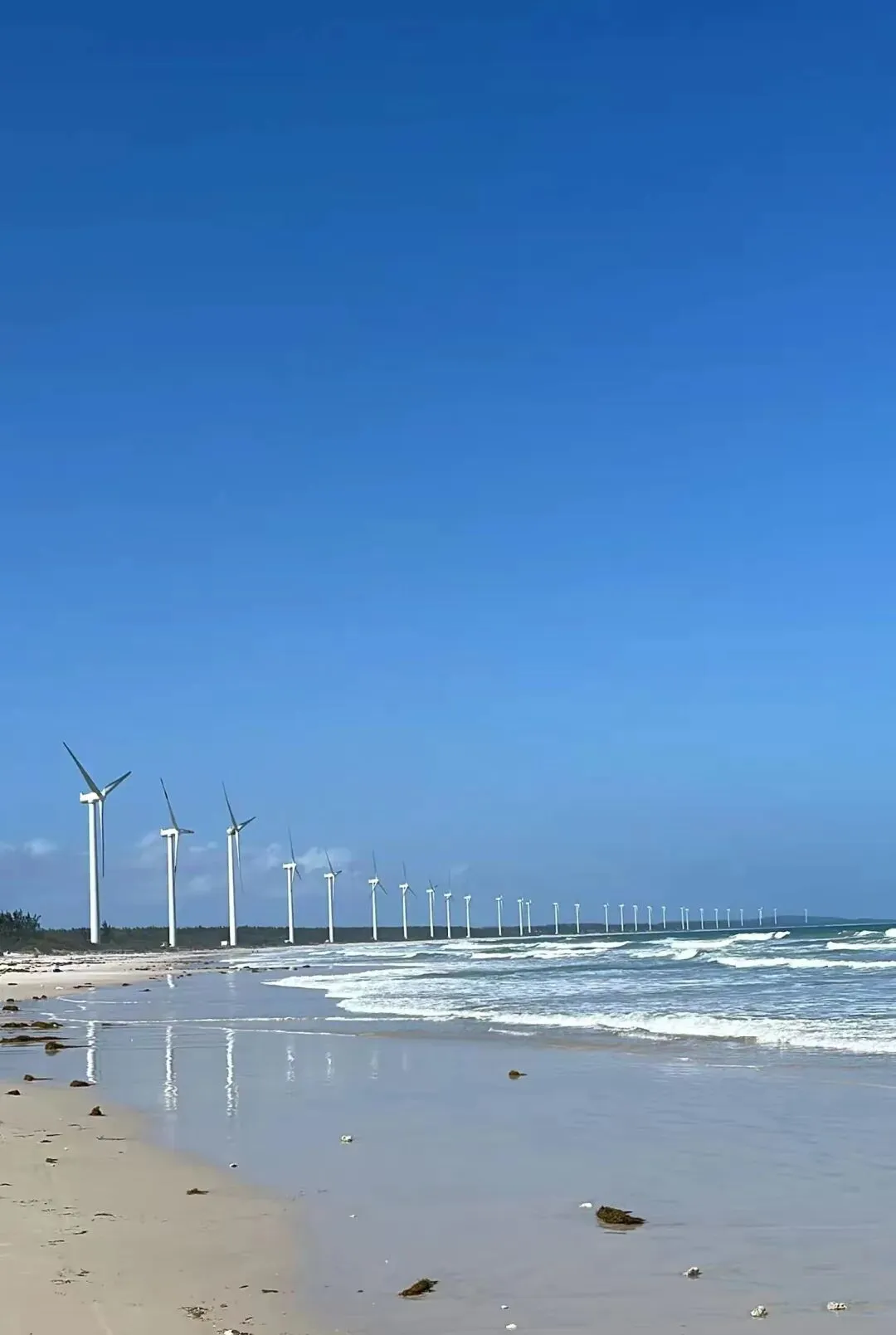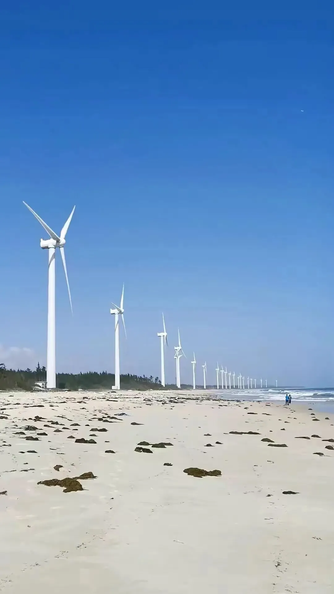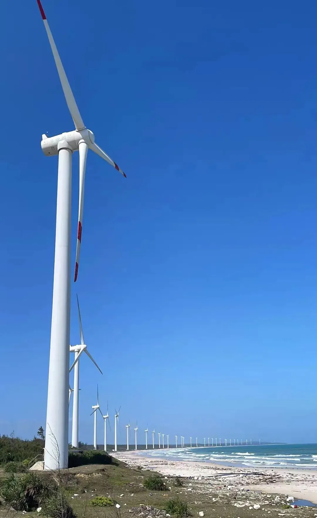 第一眼看到风车群,那种震撼很难用语言形容。每一台风机都有几十米高,洁白的塔身在阳光下闪着金属光泽。巨大的叶片缓缓转动,在海面上投下流动的影子。这里的海不是三亚那种温柔的蓝,而是带着一点墨色的深蓝。海浪很大,一波接一波地拍打着礁石,发出轰隆的巨响。海水在阳光的照射下呈现出蓝宝石般的质感,波涛汹涌却又透着一种深邃的宁静。