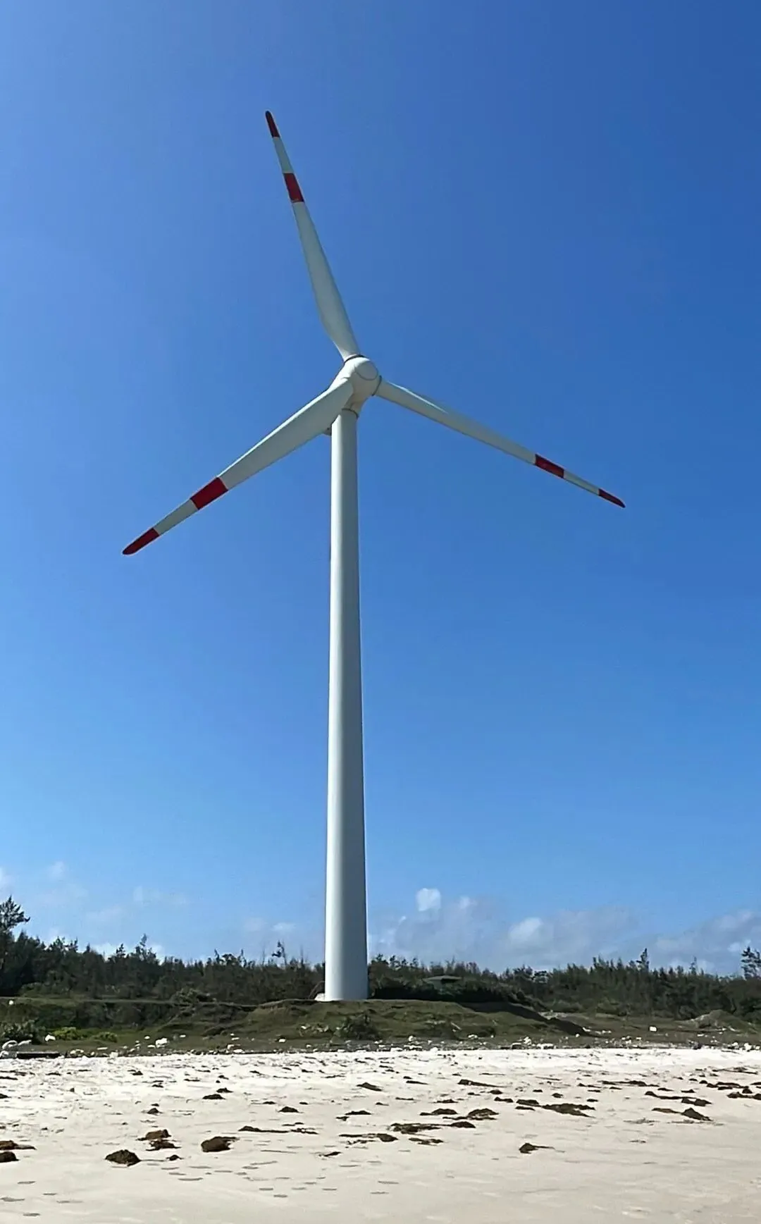 沿着海岸线慢慢走,你会发现每个角度看到的风景都不一样。有的风车离公路很近,近到能看清塔身上的检修梯;有的则远远地立在沙滩上,像守护海岸的哨兵。我们把车停在路边,赤脚踩在沙滩上。沙子很细,被太阳晒得滚烫。走到离风车最近的地方,能听到叶片切割空气发出的“呼呼”声,低沉而有力,像是大海的呼吸。