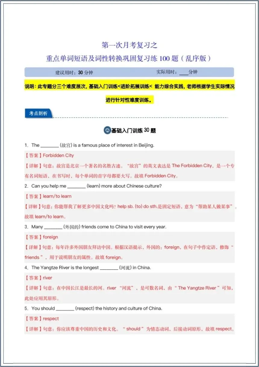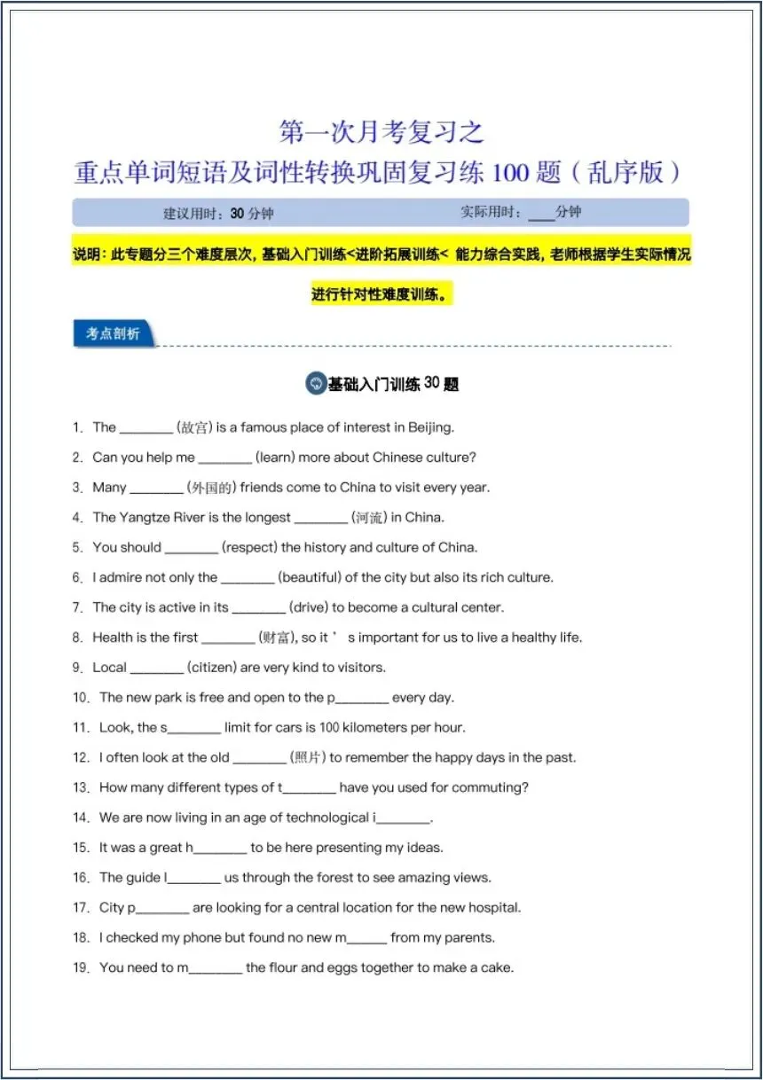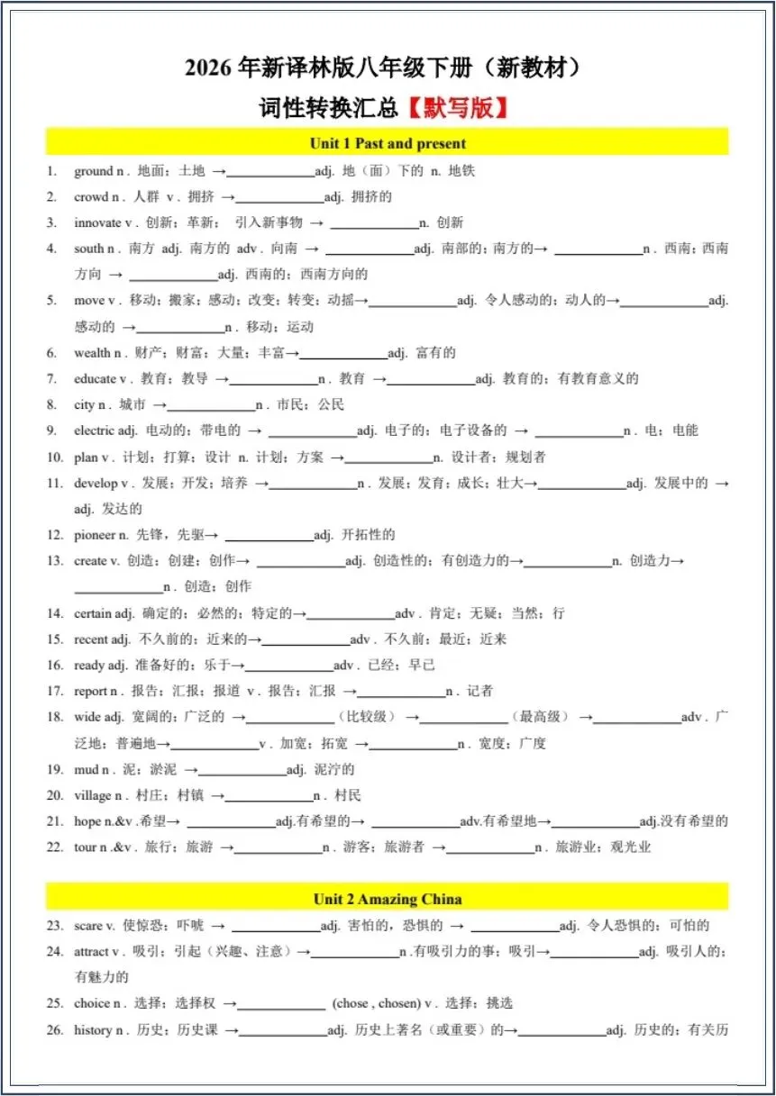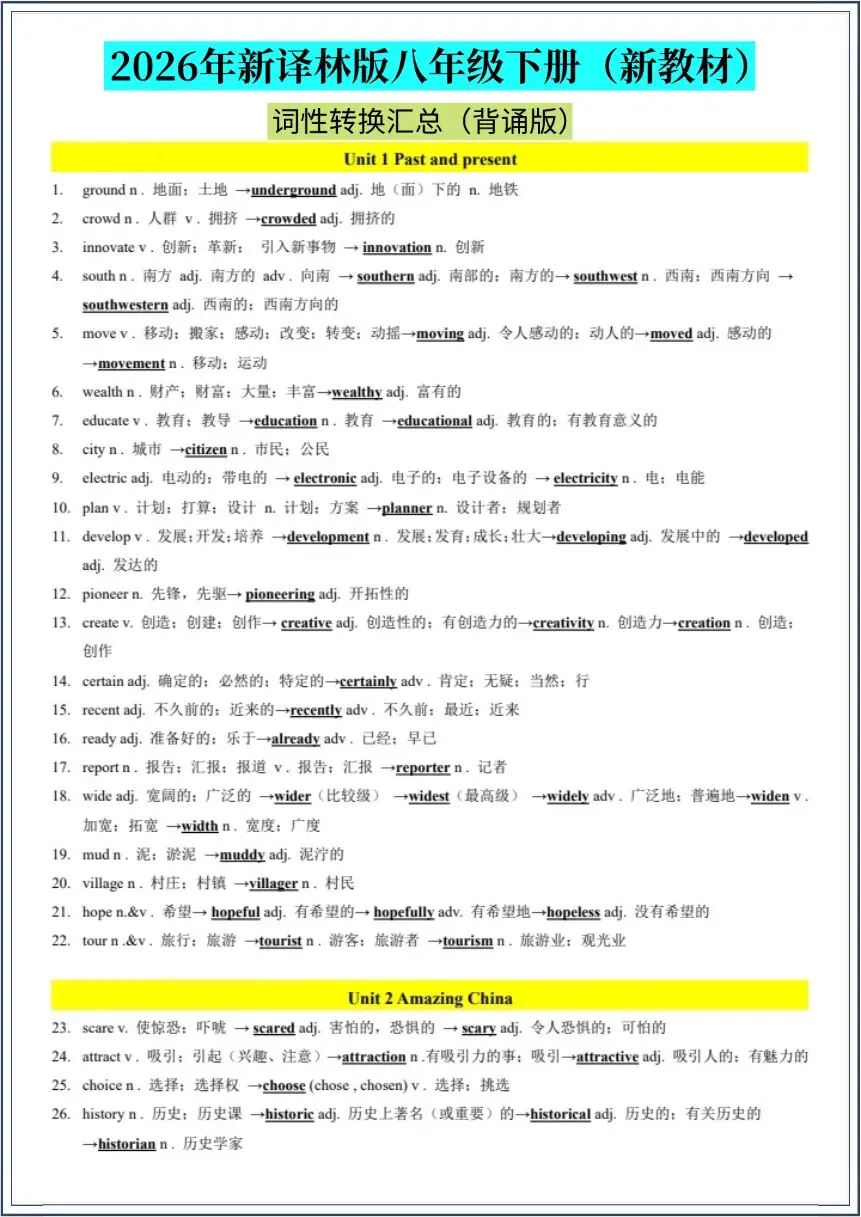 2026春新(译林版)八年级下册《英语》词性转换汇总(背诵+默写版》月考复习之重点单词短语及词性转换巩固复习练100题,电子版可下载打印!