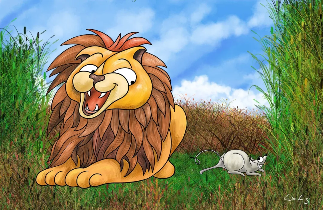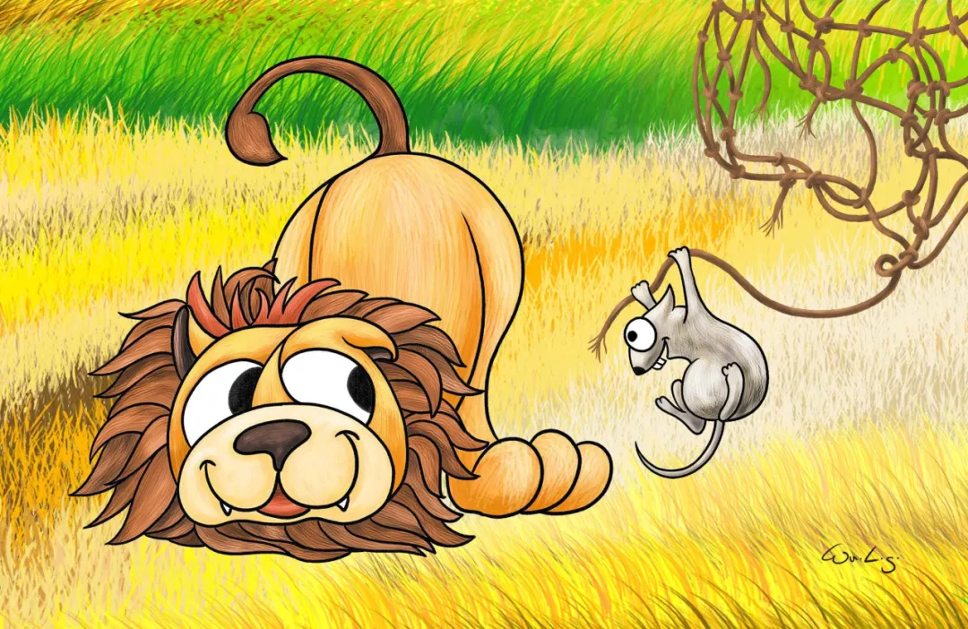 6. 狮子终于挣脱绳索,并诚心地向老鼠道谢与致歉,说:「谢谢你救了我,我不该因你看起来弱小而轻视你。」