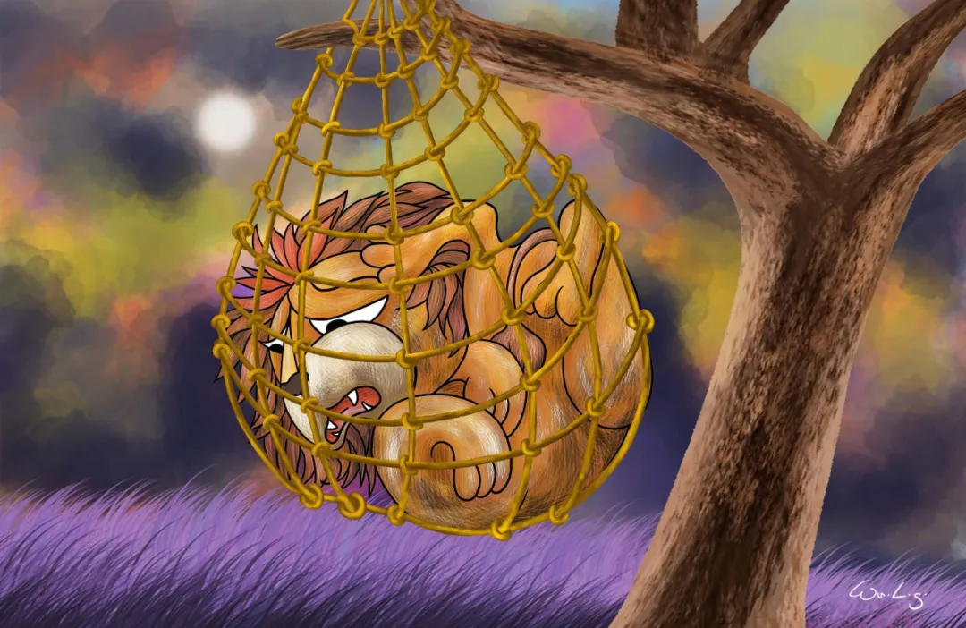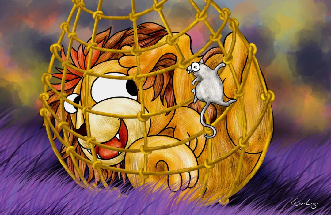 5. 路过的老鼠发现后,说:「狮子大大别怕,我来帮你!」并迅速地啃起了绳索。