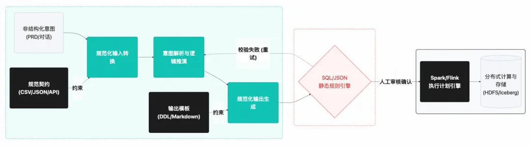 规范化输入: 将 DDL、业务口径文档及上游数据分布特征作为上下文输入给模型。
