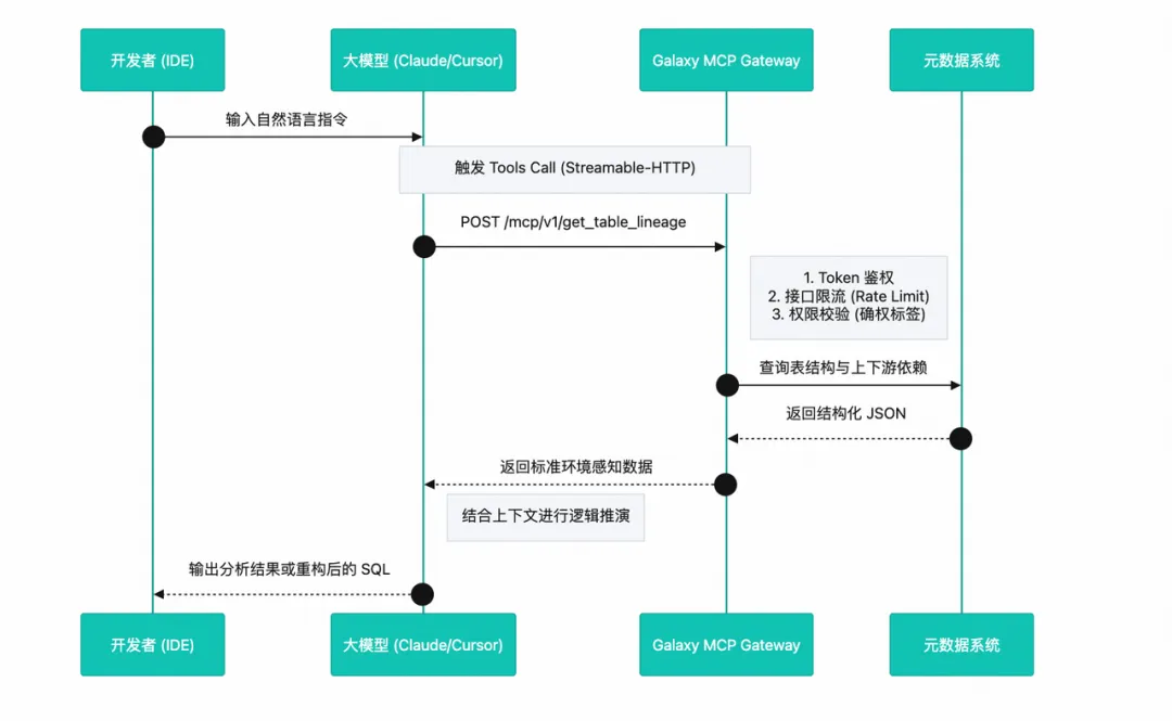 要实现上述的“规范化输入与输出”,大模型必须具备感知和操作企业真实数据环境的能力。在实践中,研发团队基于模型上下文协议(Model Context Protocol, MCP),为内部数据研发平台(Galaxy)构建了标准化的集成底座。