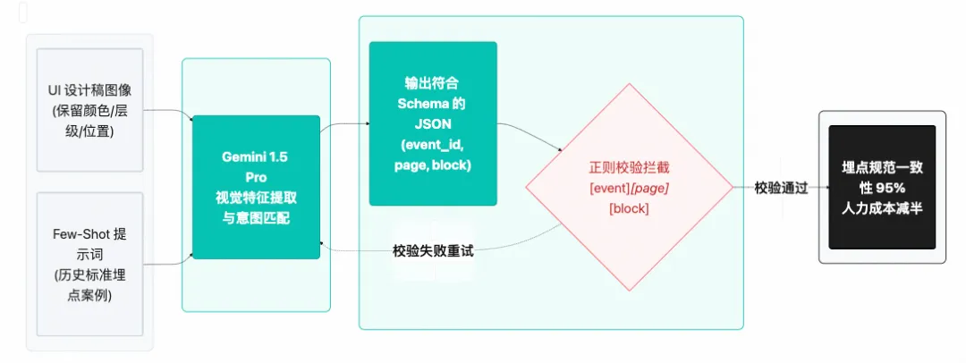 需求解析与确认(前置收敛): 构建规范化的 PRD 理解 Prompt,结合原生多模态模型(如 Gemini 1.5 Pro,保留 UI 设计稿的颜色、层级、空间位置等视觉特征),输出标准化的“埋点提需文档”。经业务多轮确认无误后,再进入实质埋点设计环节。