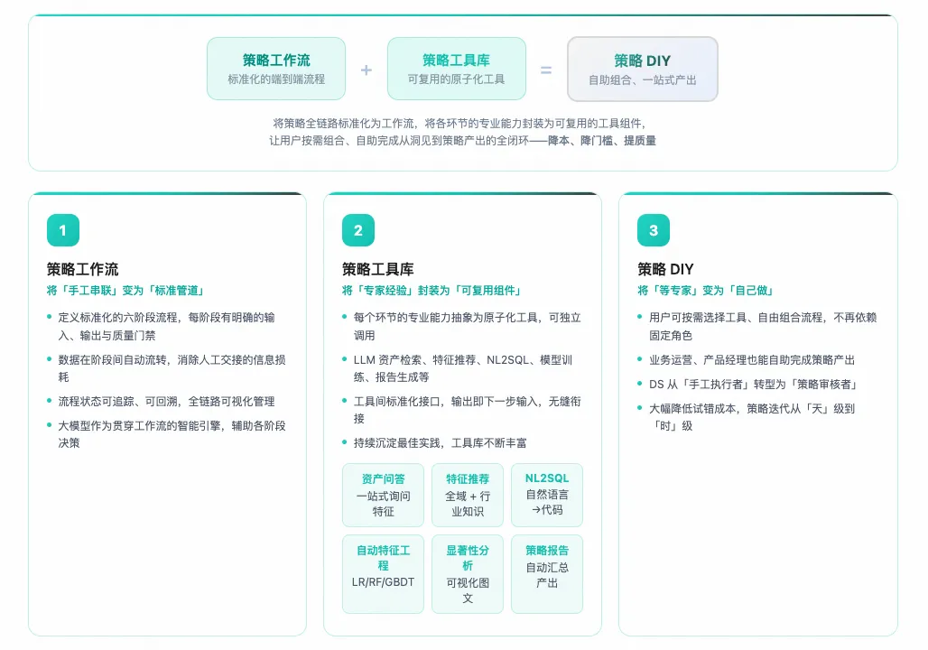 实测效能: 策略生成到落地的整体周期由 10 人日缩短至 1-2 人日,提效 3-5 倍。AI 的介入不仅加快了策略迭代的频率(策略新鲜度),更通过标准化流程降低了对个人隐性经验的依赖,使得策略的专业度与准确率显著提升。