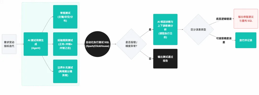 实测效能: 构建了“质量守夜人”机制,测试覆盖率大幅提升。在某财务项目中,模型自动生成了 20 余个复杂的校验 SQL,将数据质量卡点前置到开发阶段,显著降低了上线后的数据事故率,实现了从“人工抽测”到“机器全量自动化校验”的范式跃迁。