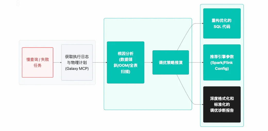 智能诊断推演: LLM 充当“认知运行时”,基于输入的结构化日志,结合历史调优专家经验库(如“Shuffle 阶段数据量剧增且单 Task 耗时极长 → 数据倾斜”),进行逻辑推演。