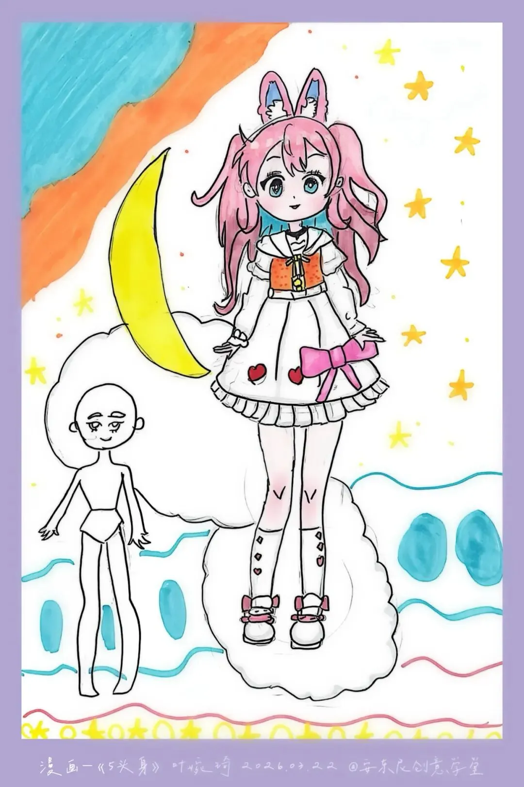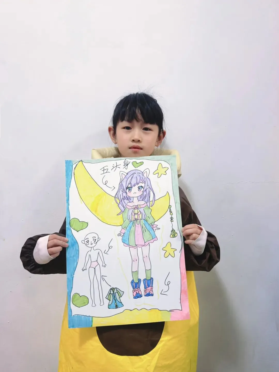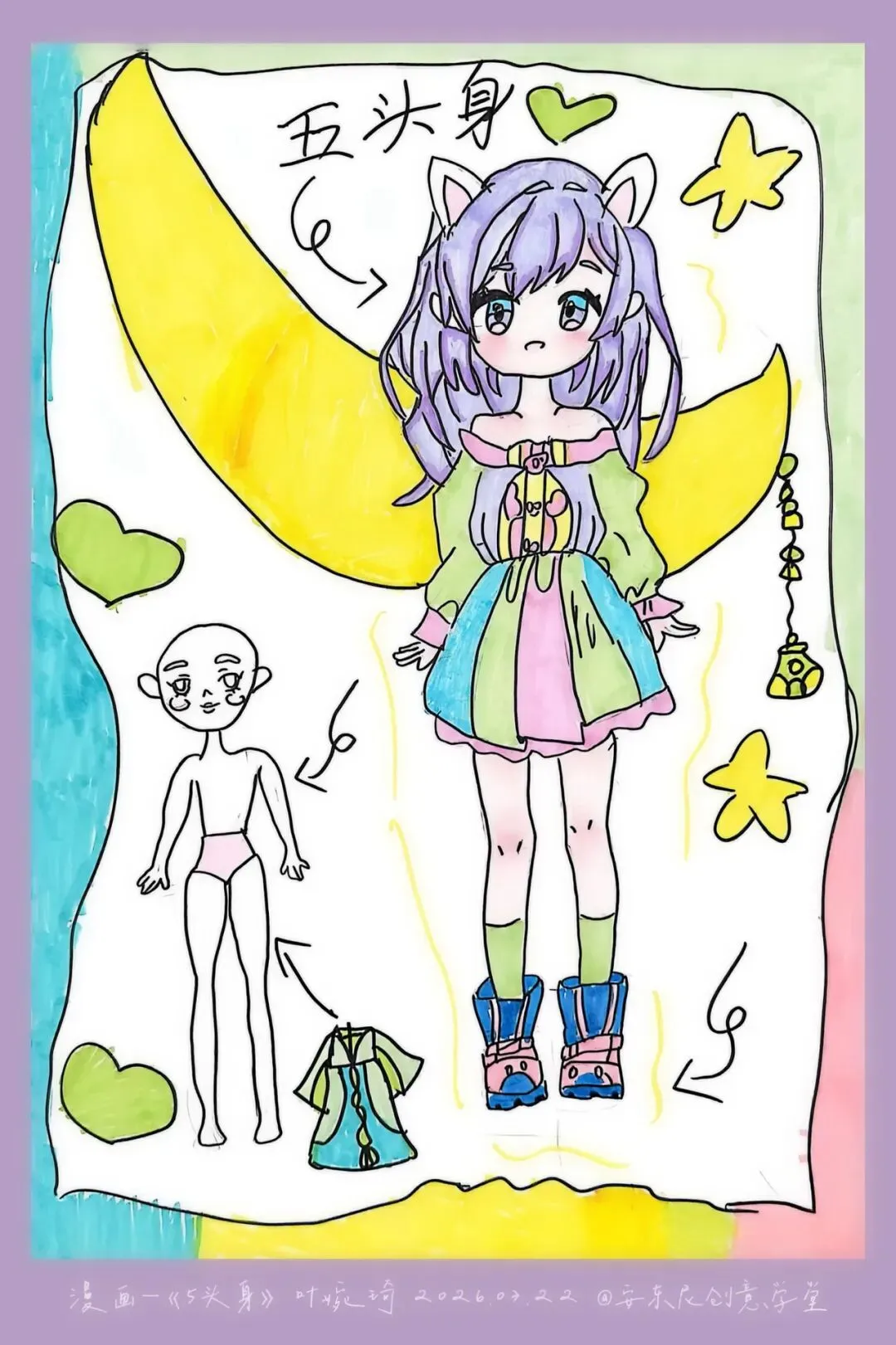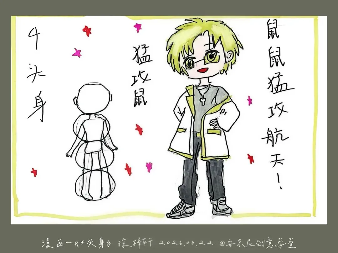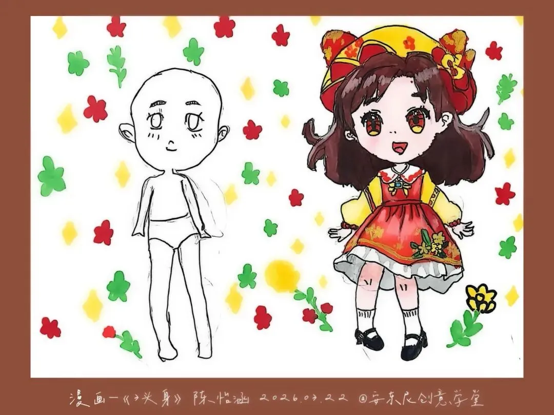 三年级—漫画五头身 亲爱的家长们 这节课宝贝们完成了《5头身漫画人物》创作课,学习漫画人物的比例、造型与装饰设计,用画笔勾勒出灵动可爱的角色形象。比例认知 掌握漫画人物5头身的基础比例,学习头身比与肢体长度的对应关系,建立规范的人物造型基础。造型特征 学习Q版/漫画人物的面部特征、发型设计与肢体动态,把握可爱、灵动的造型特点。创意装饰 为人物搭配服饰、配饰、背景元素,运用色彩、图案丰富角色形象,提升画面表现力与装饰美感。 角色换装纸娃娃: 画一个5头身人物基础模板,制作多套服装,让孩子自由搭配换装。