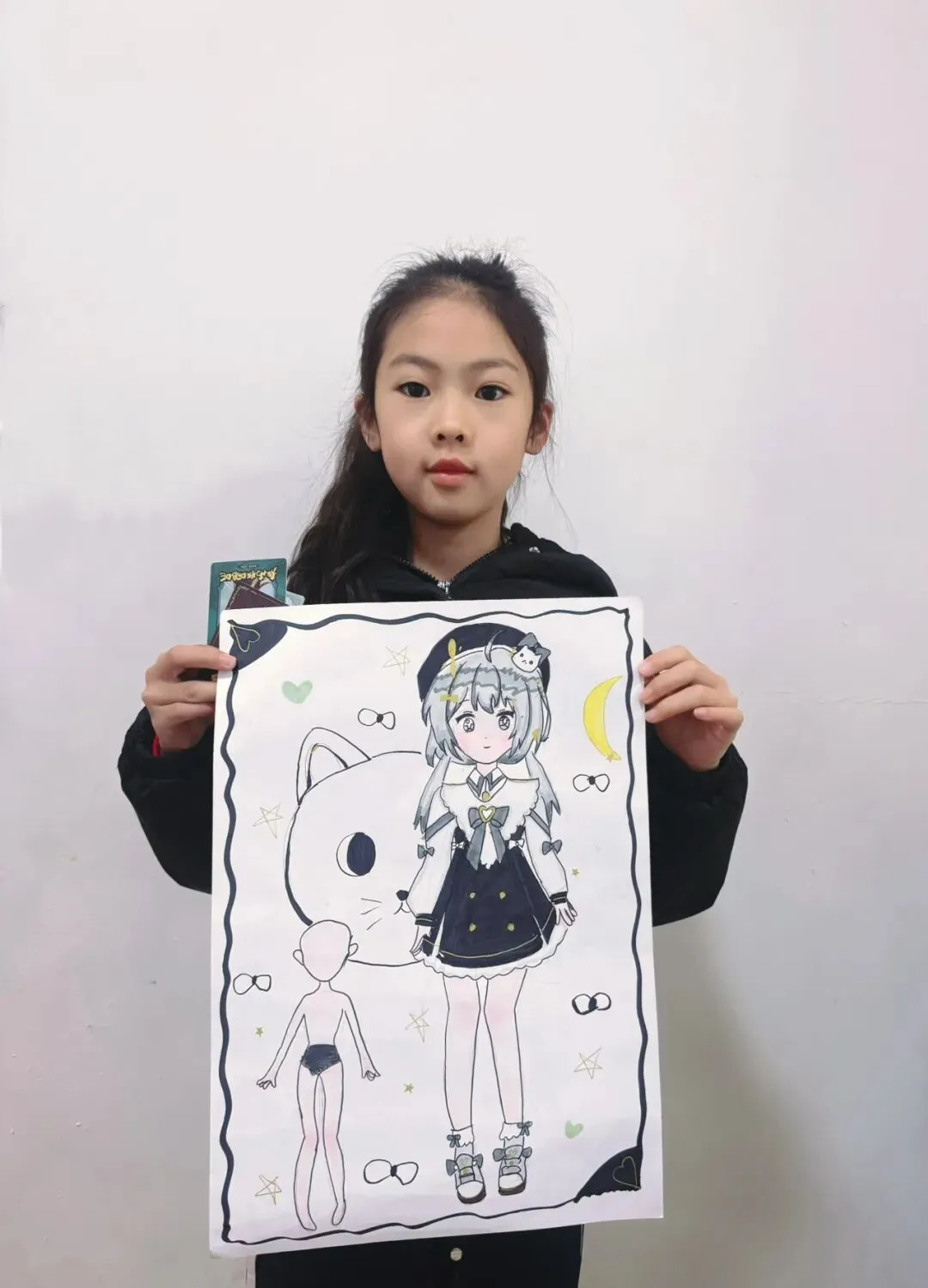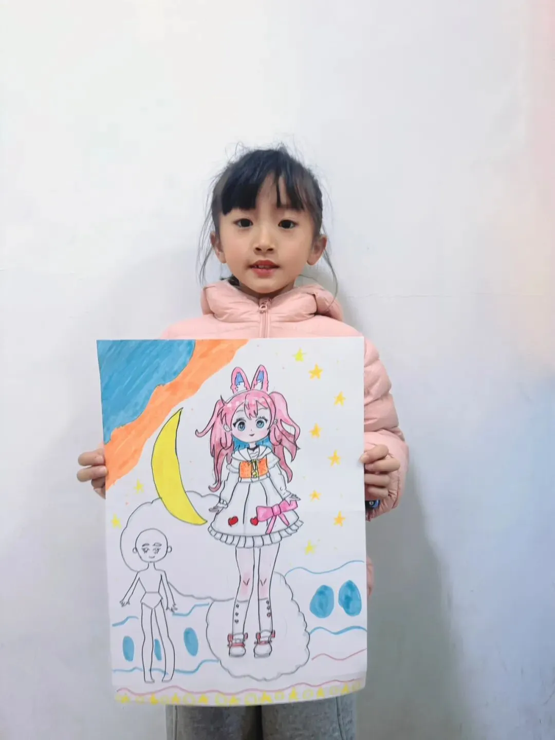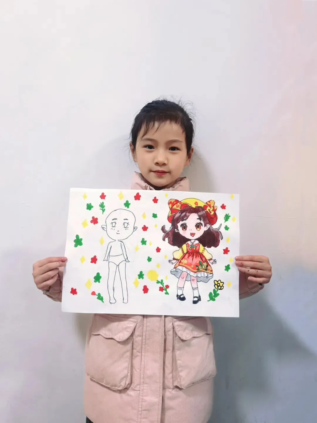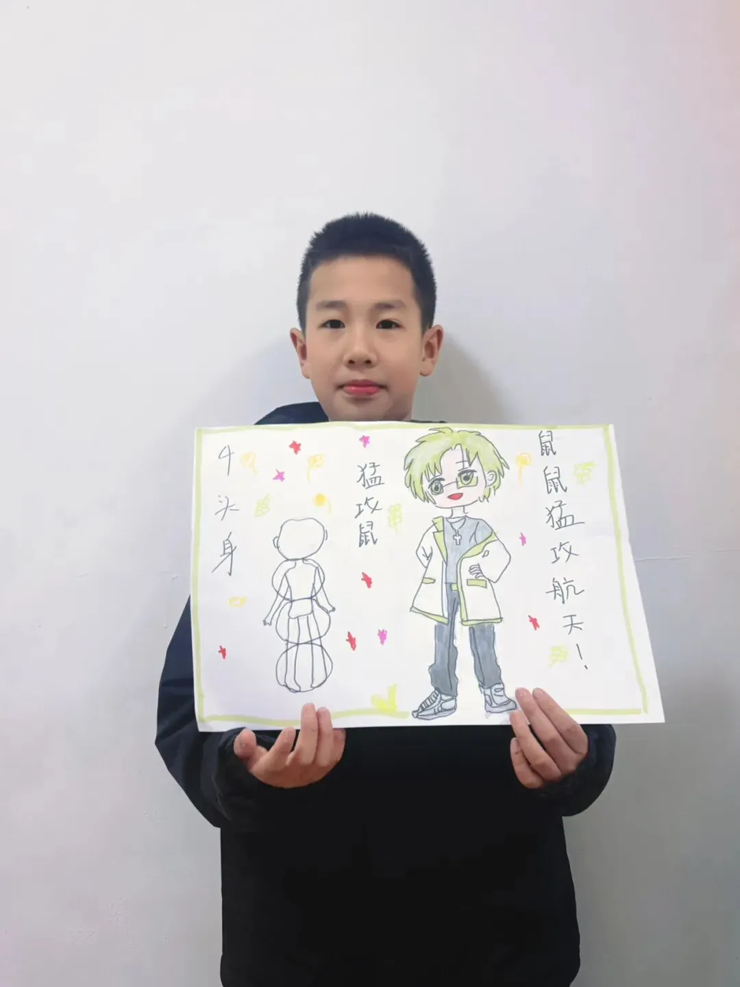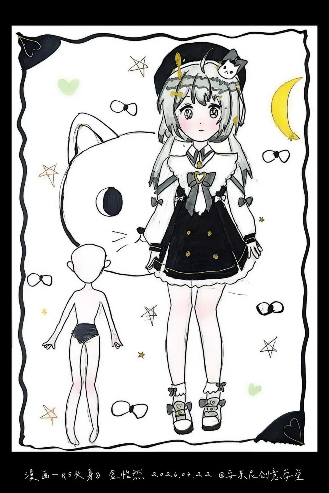 三年级—漫画五头身 亲爱的家长们 这节课宝贝们完成了《5头身漫画人物》创作课,学习漫画人物的比例、造型与装饰设计,用画笔勾勒出灵动可爱的角色形象。比例认知 掌握漫画人物5头身的基础比例,学习头身比与肢体长度的对应关系,建立规范的人物造型基础。造型特征 学习Q版/漫画人物的面部特征、发型设计与肢体动态,把握可爱、灵动的造型特点。创意装饰 为人物搭配服饰、配饰、背景元素,运用色彩、图案丰富角色形象,提升画面表现力与装饰美感。 角色换装纸娃娃: 画一个5头身人物基础模板,制作多套服装,让孩子自由搭配换装。