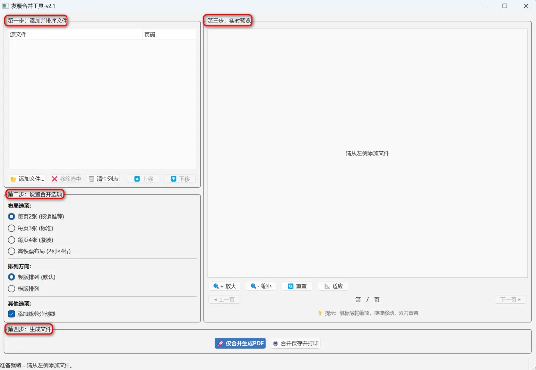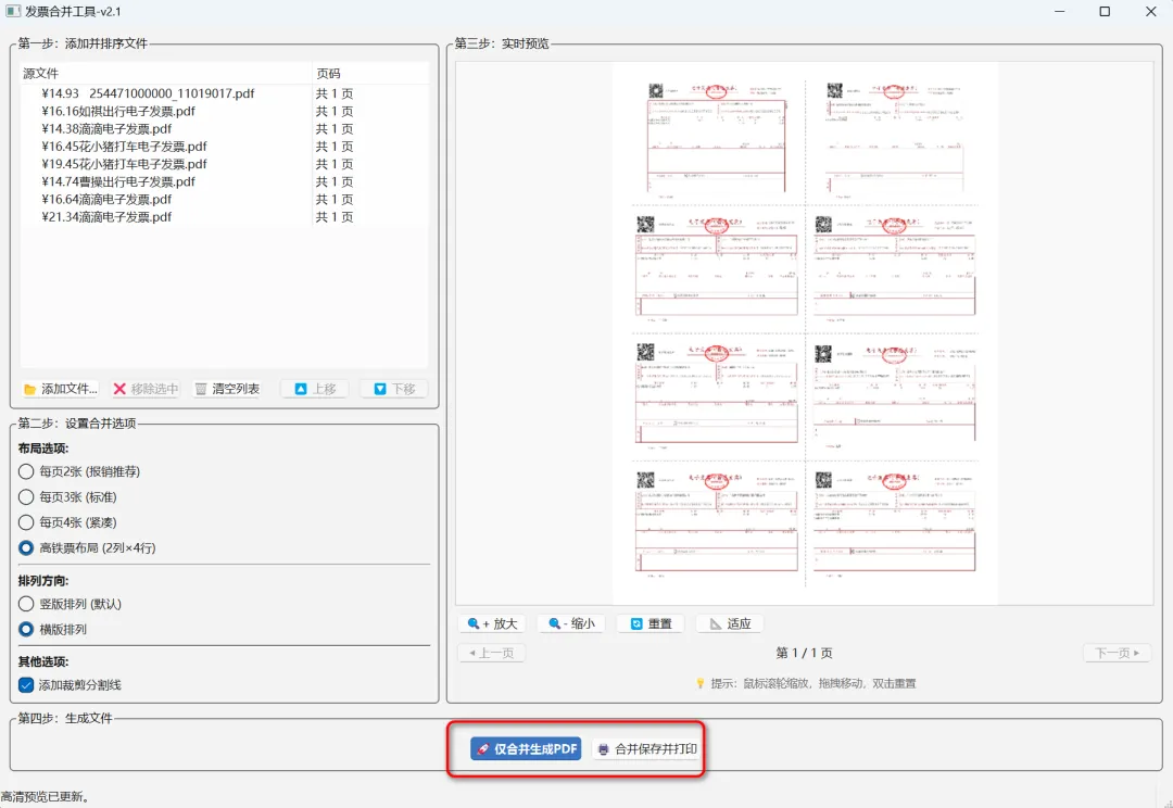 跟之前推荐的发票合并软件比,它多了个实时预览功能——设置完布局马上能看到合并后的样子,不合适当场调,不用等打完才发现排错了。