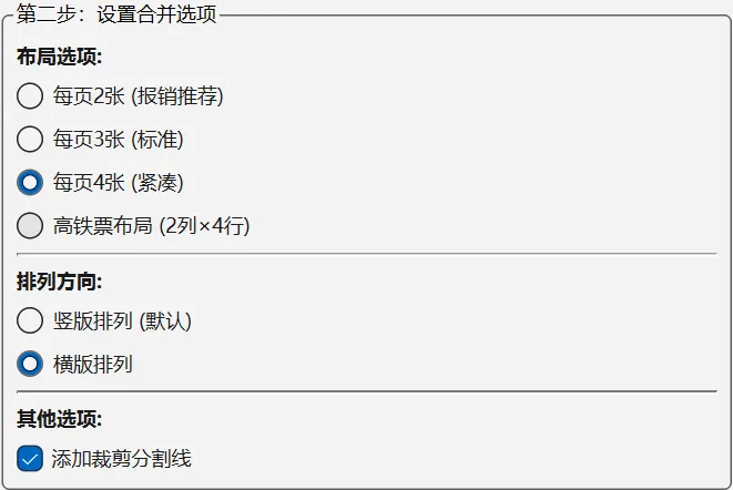 设置合并选项时能调发票布局——每页放2张、3张还是4张都行,排列方向也能选竖版或横版,按你打印机习惯来,省得后期裁切。