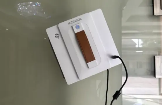 KONKA擦窗机器人外观采用经典白色设计,棕白撞色。在清洁使用方面,它支持3000pa吸力,相对比市面上其他同价位的机型,吸力较大,使用的时候能够牢牢的吸附在墙面上,采用了自动双向喷水设计,运用超声纳米雾化技术,这一设计能够让机器喷水更加均匀以便能够更全面的清洁窗户!
