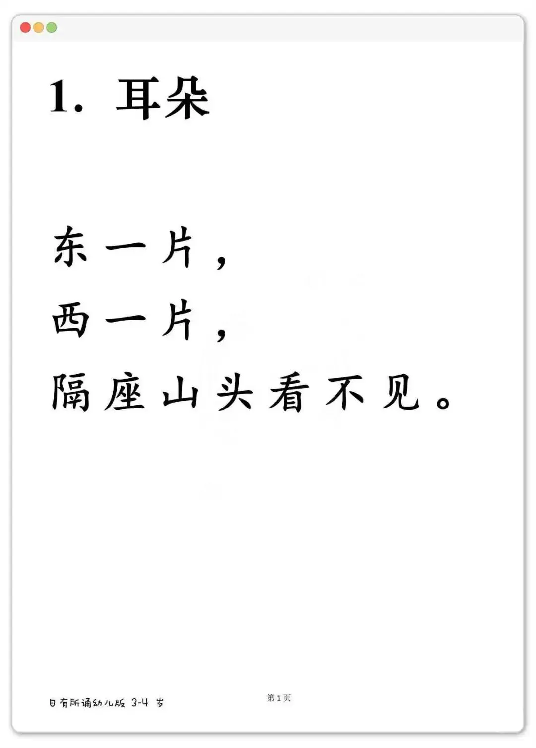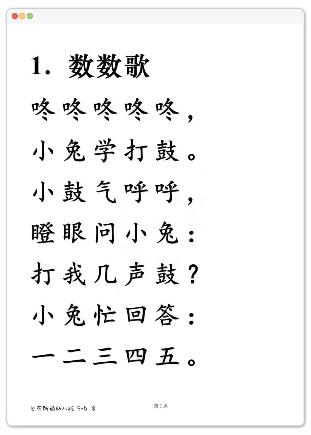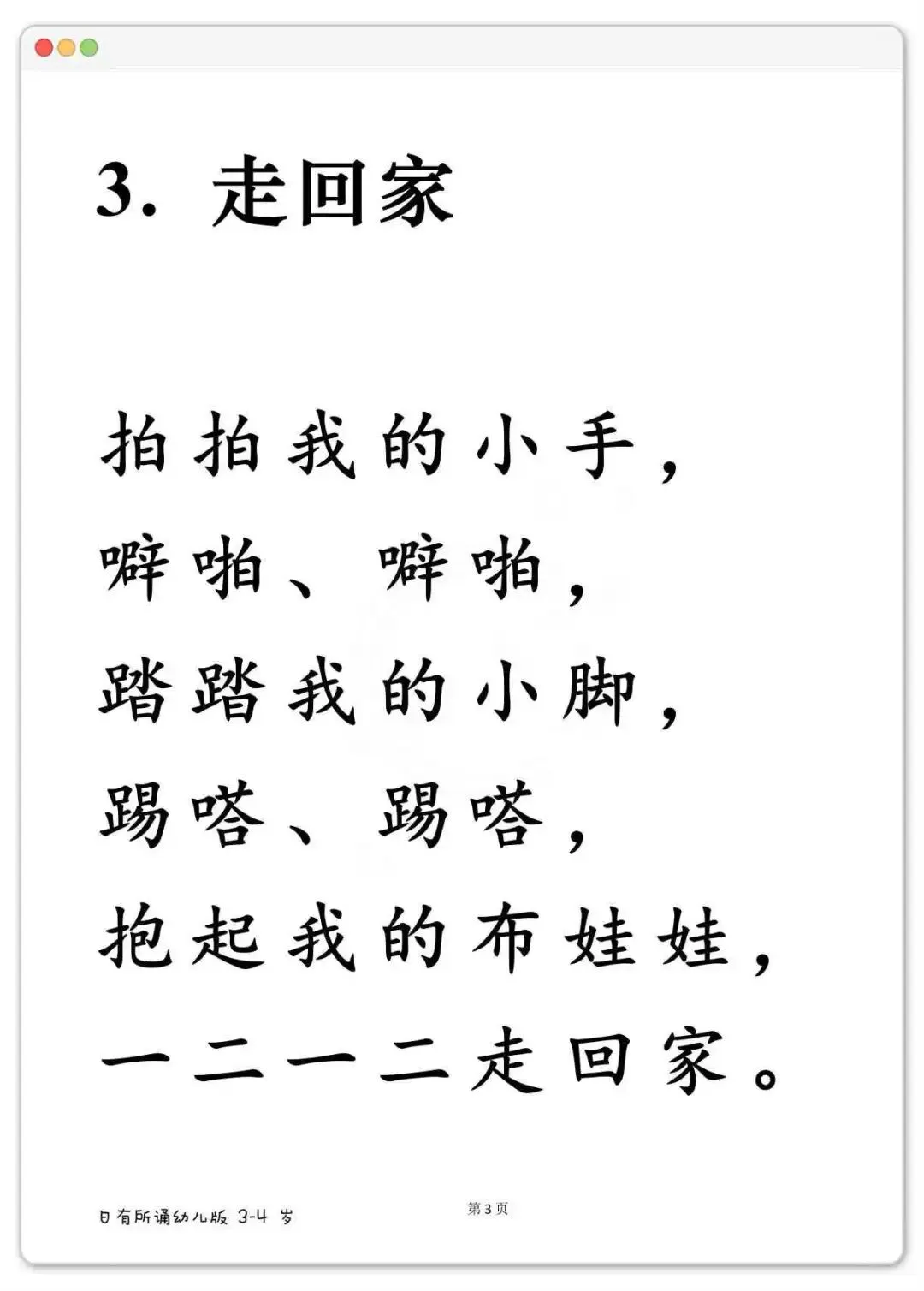 幼儿晨读好帮手,日有所诵大字版288篇可打印 《日有所诵》幼儿版,分3-4岁、4-5岁、5-6岁三个阶段。里面全是儿歌、古诗、小散文、谚语,读起来顺口不拗嘴。每天一篇,不费劲,孩子跟着读着读着,字就认识了。
