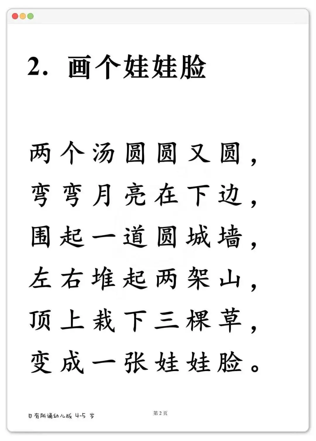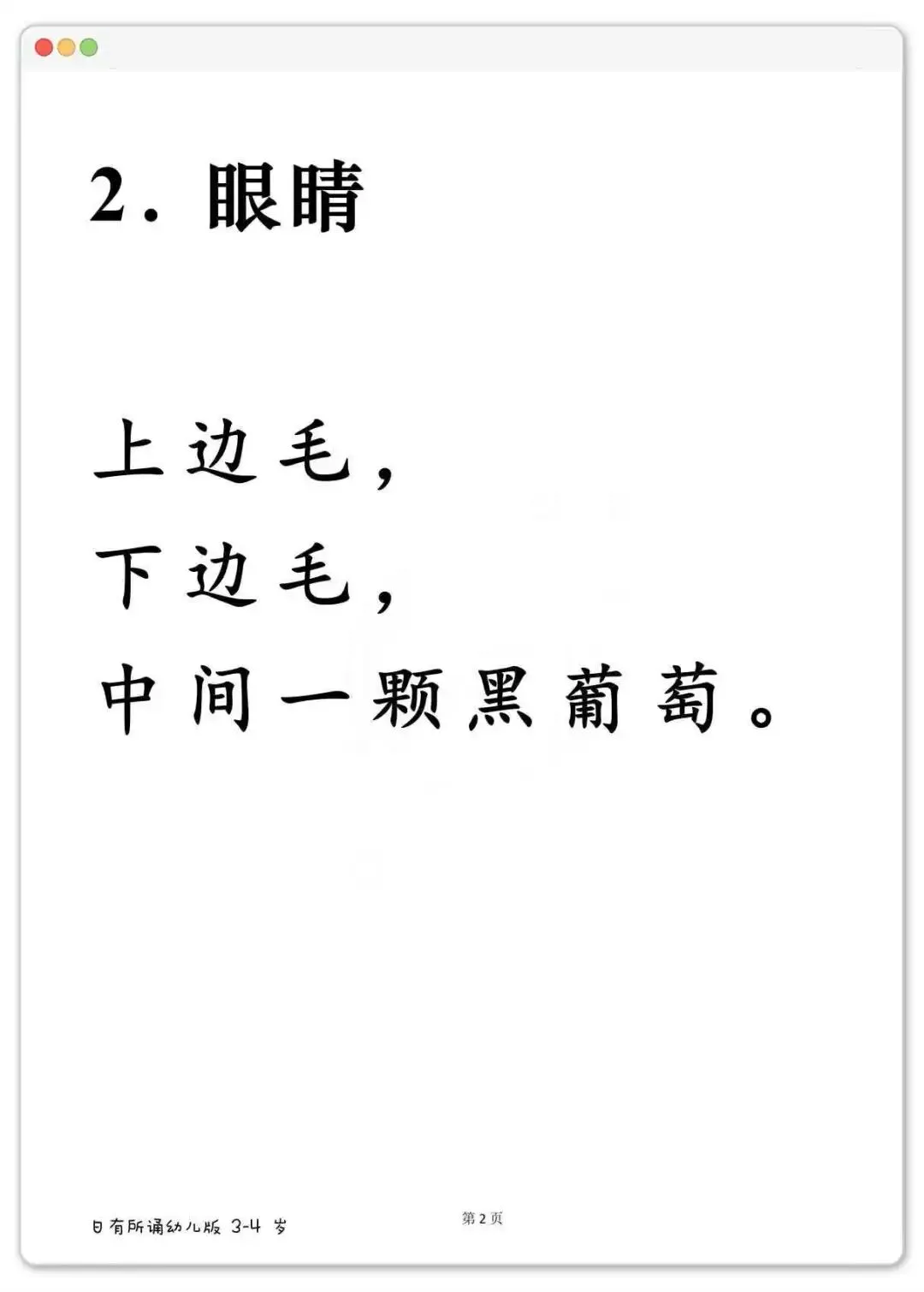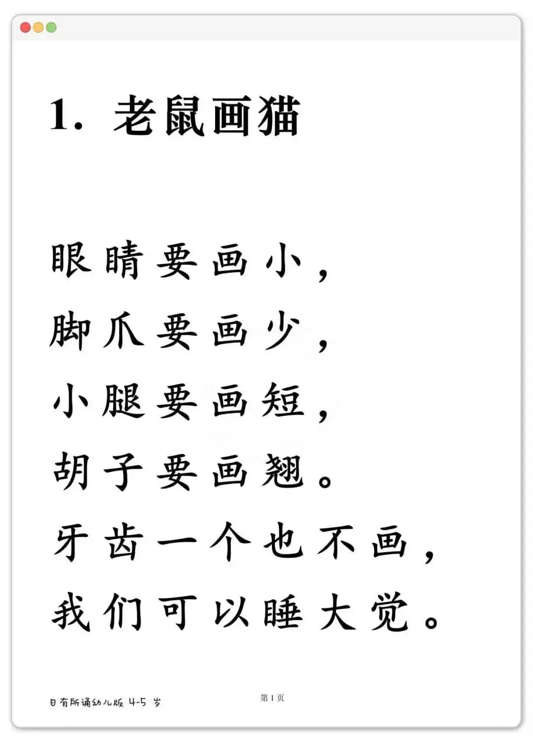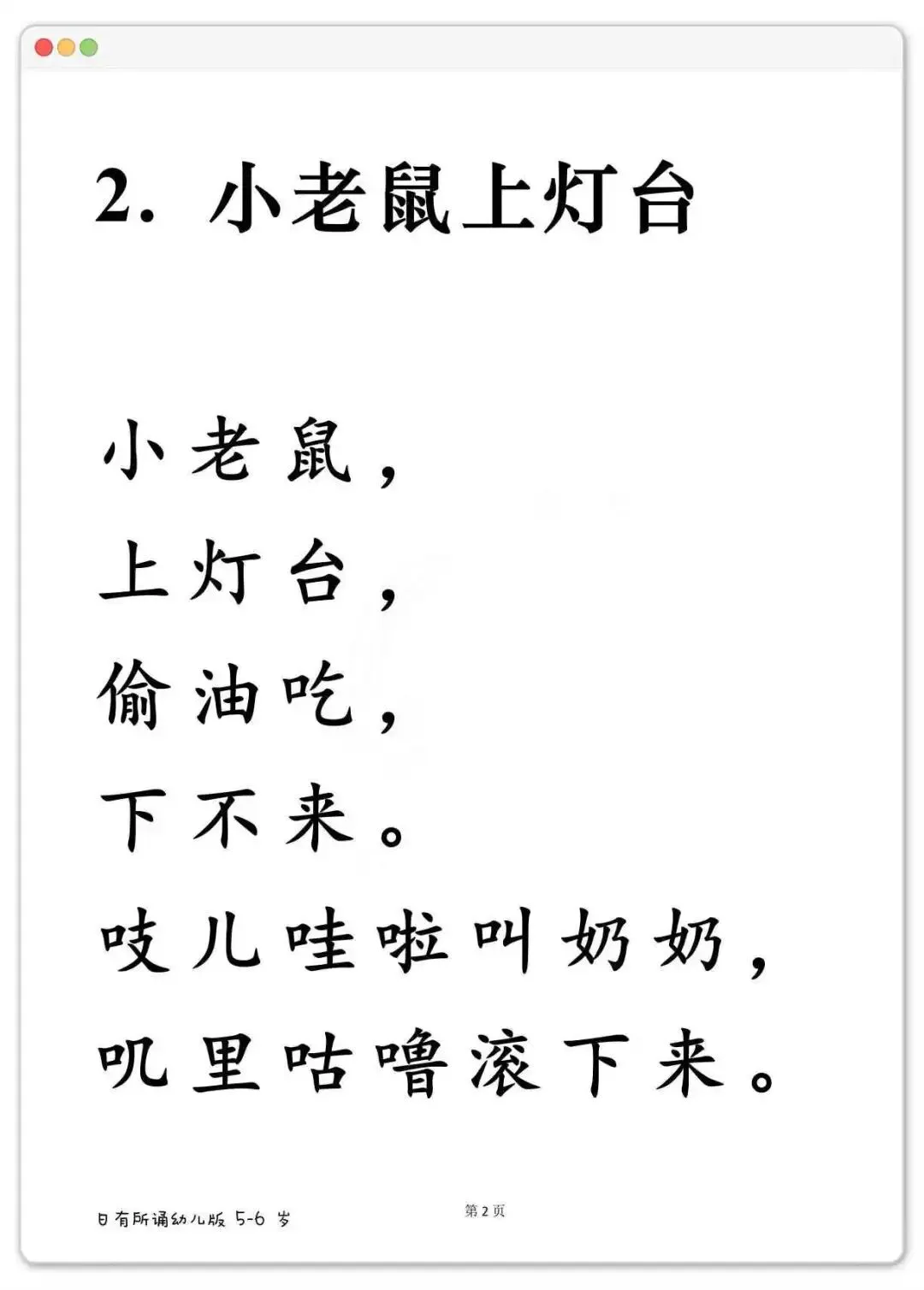 幼儿晨读好帮手,日有所诵大字版288篇可打印 《日有所诵》幼儿版,分3-4岁、4-5岁、5-6岁三个阶段。里面全是儿歌、古诗、小散文、谚语,读起来顺口不拗嘴。每天一篇,不费劲,孩子跟着读着读着,字就认识了。