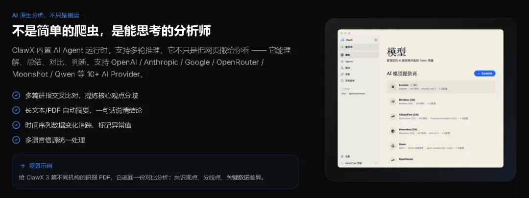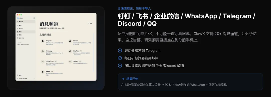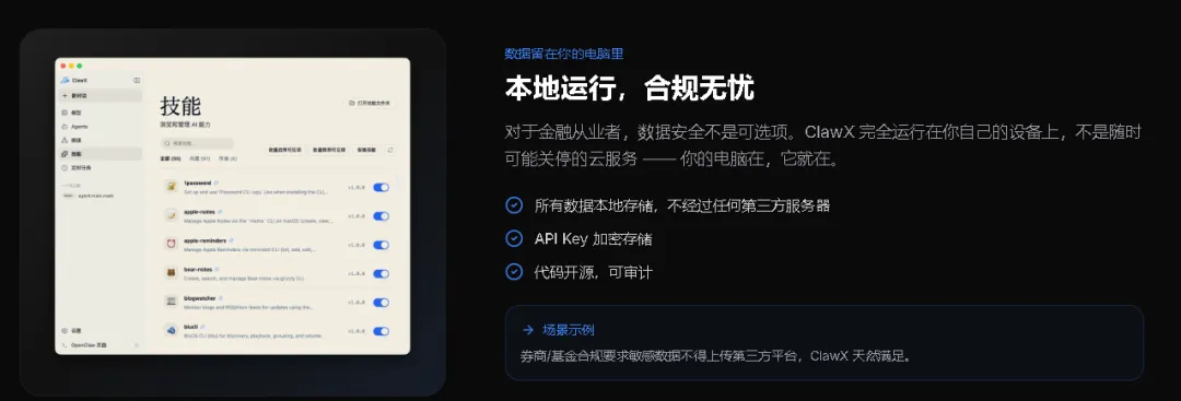 一句话速览:ClawX是一款跨平台桌面应用程序。它将目前全网最火爆、但也最难伺候的基于CLI的AI编排工具OpenClaw,套上了一个极其优雅、开箱即用的图形化桌面引擎。它既有深厚的“金融数据处理DNA”,又在客户端架构设计上极其硬核。你不必敲一行命令,只需提供一台电脑,它就能化身7×24小时在线、数据绝对留在本地的私人研究员,自主穿梭于各大金融终端,并可以通过微信、飞书等全渠道向你汇报。