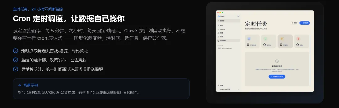 这是ClawX成为生产力神器的灵魂。无需学习Cron表达式,可视化调度器让你轻松设定“每天早8点”或“每隔15分钟”。