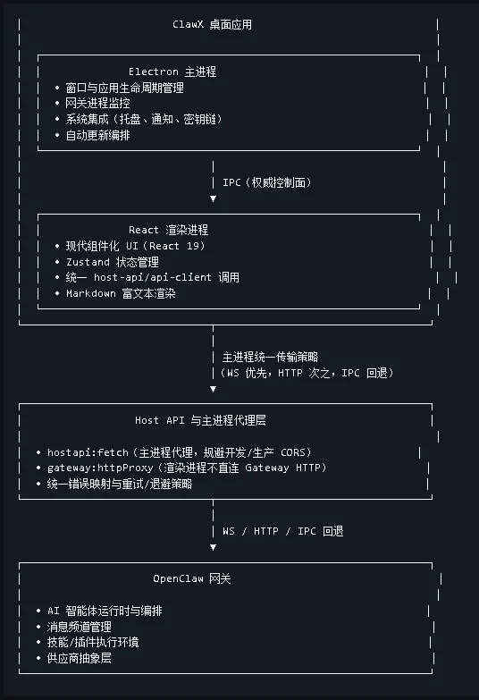 用Electron打包内嵌复杂Node.js AI运行时的应用,极易写成卡死系统的“屎山代码”。ClawX采用健壮的 双进程 + Host API 统一接入架构,协议与生命周期由Electron主进程统一管理: