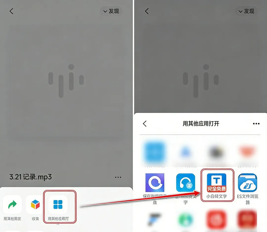 只需把微信里接收到的语音文件,选择“其他应用打开”,再选择小白转文字就可以了。