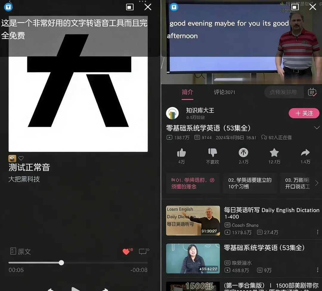 开启悬浮窗权限后,软件会以小窗形式悬浮在屏幕上方。你再打开任意视频app播放内容,字幕会实时滚动显示,看外文生肉视频或听无字幕课程时特别好用。