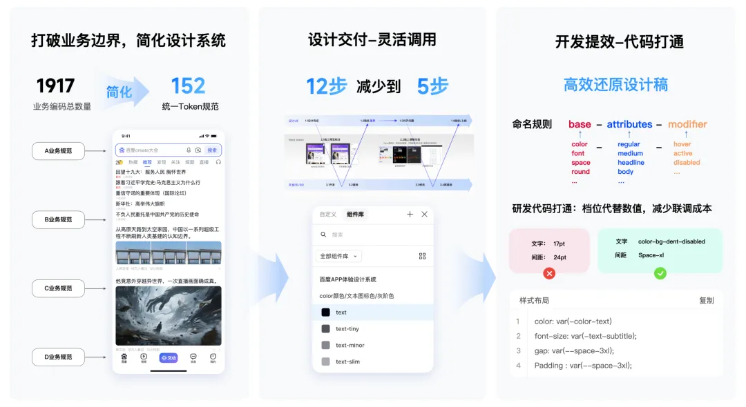 在 Figma 中建立可调用的 Token 组件库,同时与研发共建命名规范与代码映射规则。设计变量与代码变量实现映射,减少人工标注与反复联调,让适配真正具备工程级效率,设计交付链路,由12步 缩减至 5步。