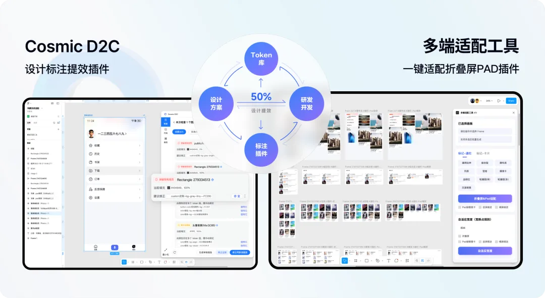 在设计系统升级之外,我们进一步优化设计交付链路。设计驱动自研插件升级提升设计及交付效率,通过推动2个自研 Figma 插件使大规模适配场景下的交付效率显著提升60%。当规则被嵌入工具,多端适配不再依赖个人经验,而成为可复制、可规模化的能力。