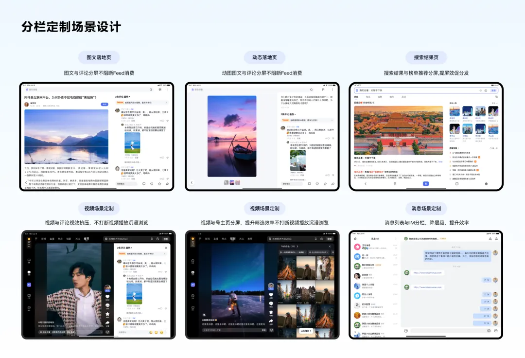 扩分栏布局场景:降低层级跳转提升大屏利用及操作便捷性能。主次内容6:4分栏布局,例如在图文落地页/视频定制大屏边看边评体验,搜索结果与热榜分栏提升屏效及分发;定制消息列表与对话分栏提升操作便捷性等等,核心思路让大屏获得与尺寸匹配的使用方式。