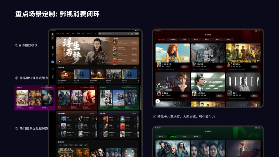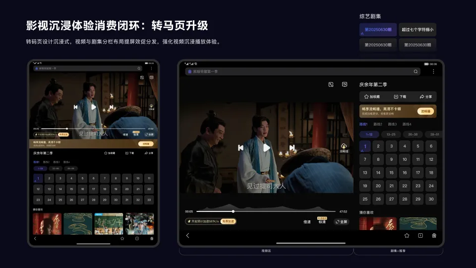 强化视频消费体验,定制影视频道及转码页设计,升级沉浸式设计与转码页形成闭环,保证体验统一。针对影视频道通过动态,运营模块推荐强化内容吸引力及频道氛围,视频剧集分栏布局强化筛选效率,打造沉浸播放提升浏览播放时长。大屏不再只是“放大版手机”,而成为更适合内容消费的形态。