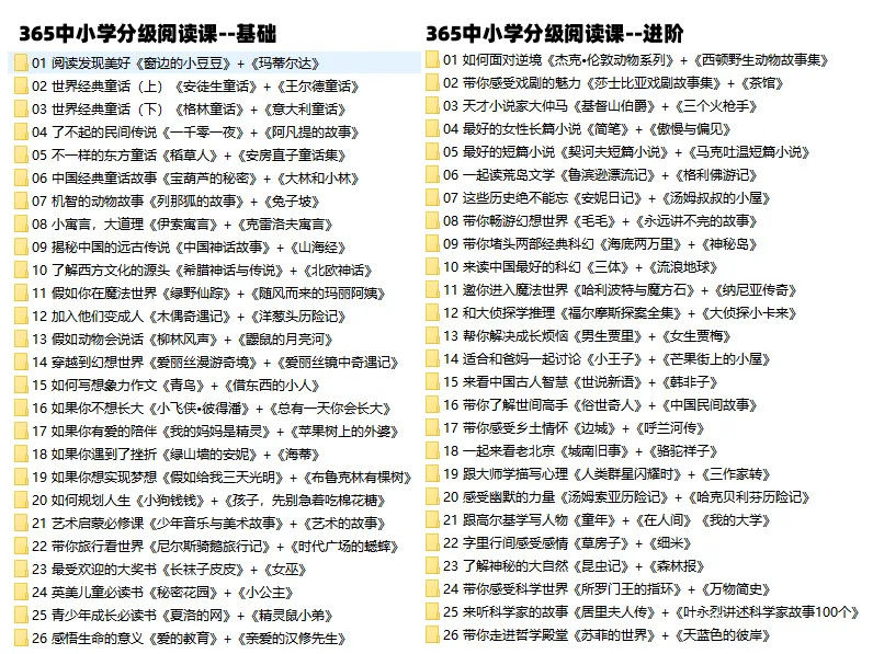 资料分为基础级和进阶级两个模块,各26个主题单元,每个单元精讲2本经典读物,总计覆盖104本中外经典名著,从童话寓言到长篇小说、科幻哲学,逐步提升阅读难度与思维深度。