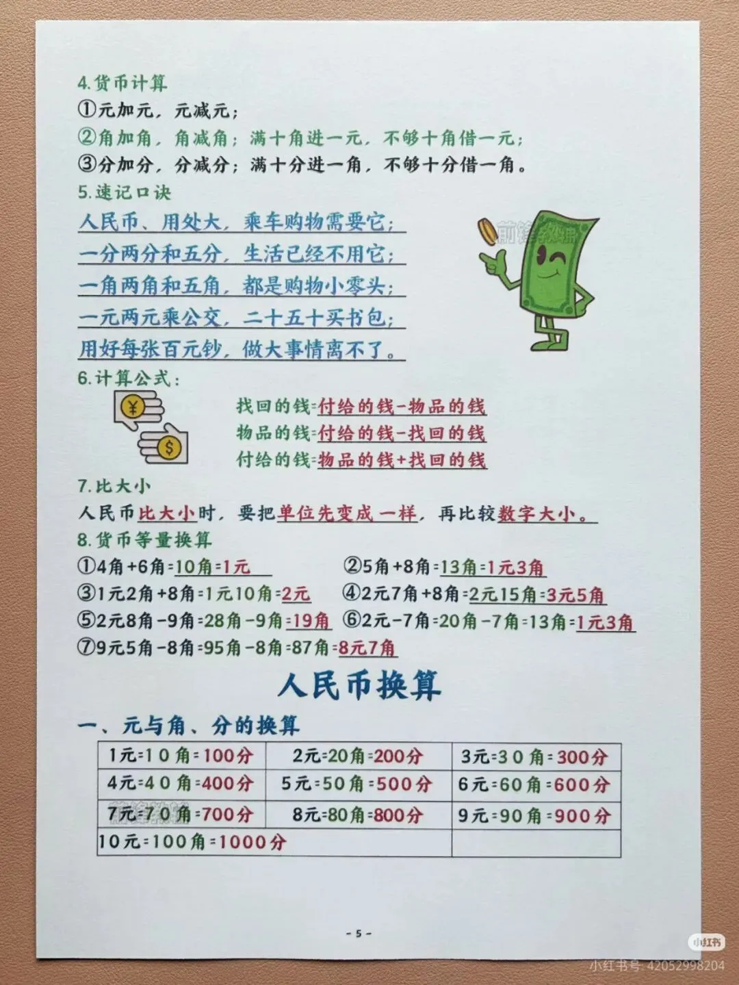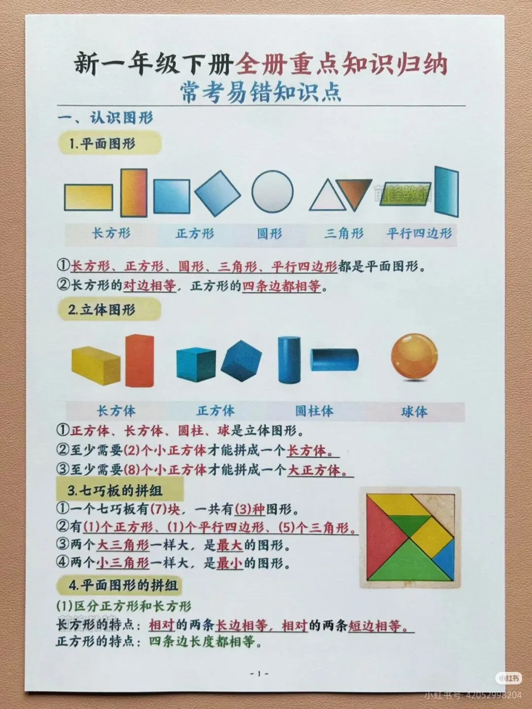 2026春一年级数学下册重点知识点汇总PDF,高清可打印版免费领,覆盖图形认知与人民币换算