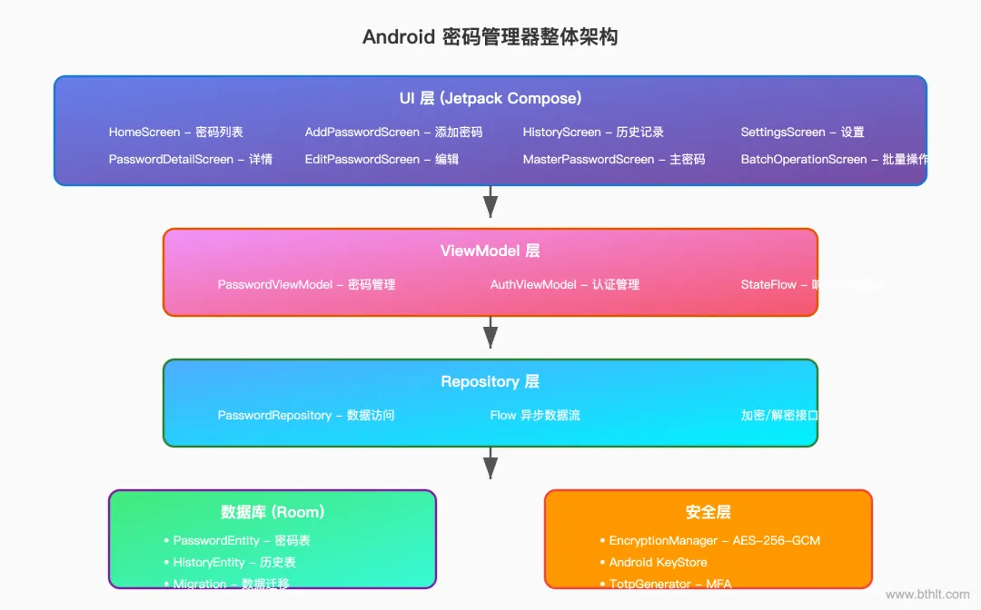 密码管理器采用 MVVM 架构,结合 Jetpack Compose 构建 UI。整体架构如下: