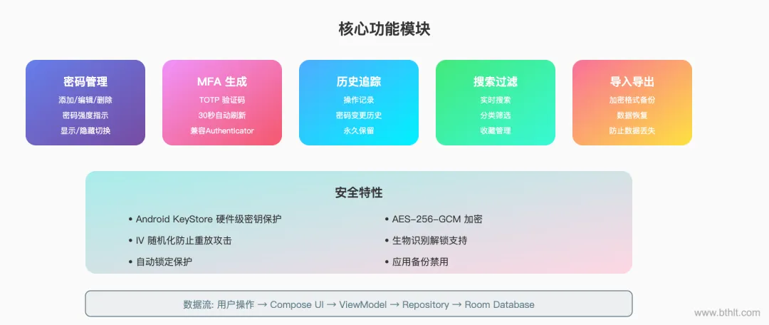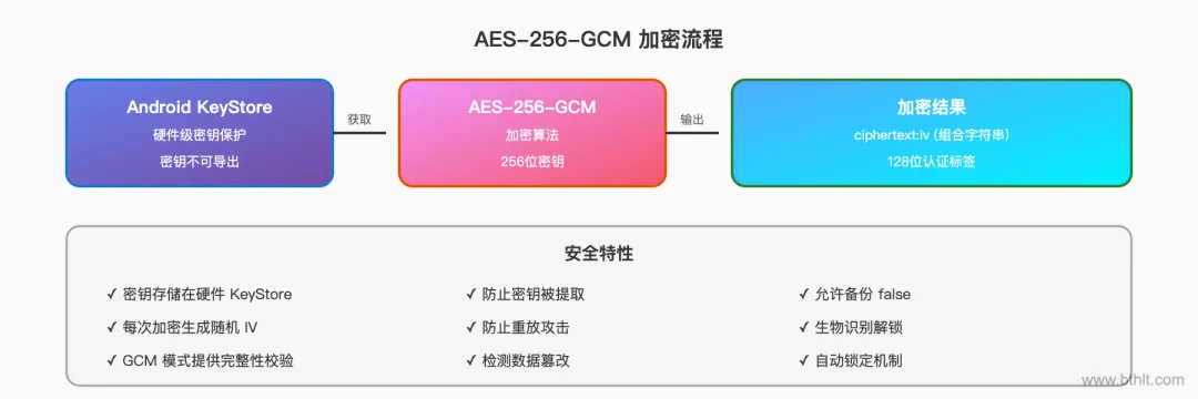 密码安全是核心功能。使用 Android KeyStore 生成并存储密钥,配合 AES-256-GCM 算法加密数据。这里有几个关键的安全细节值得注意。