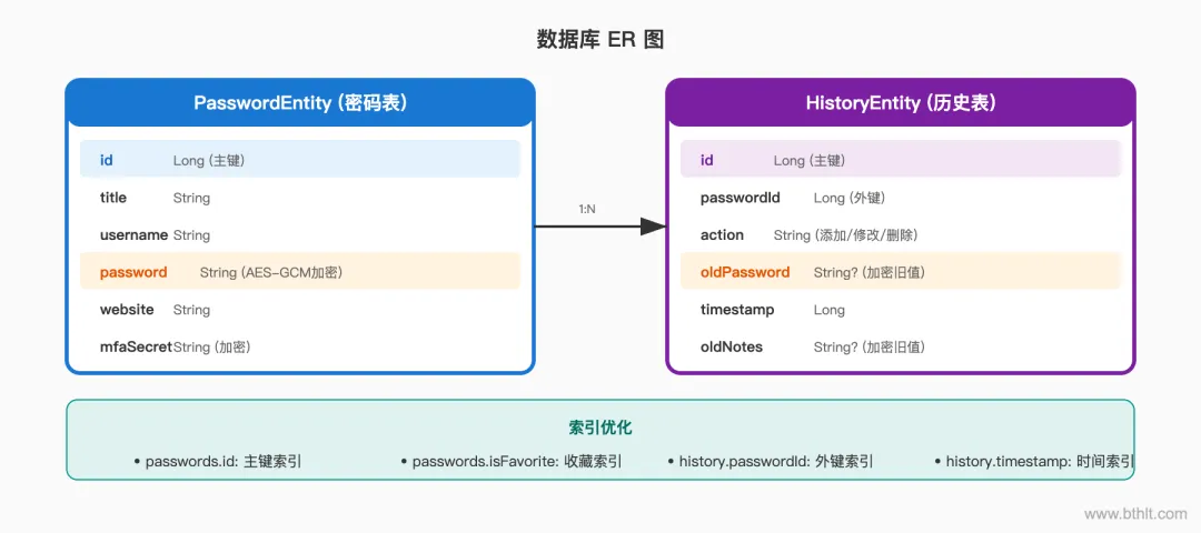使用 Room 数据库,设计了两个核心表:密码表和历史表。每个密码都对应一个历史记录集合,这种设计确保了数据的完整性和可追溯性。