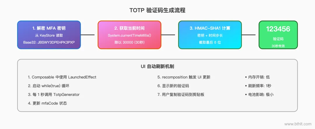 TOTP 基于时间生成一次性密码,每 30 秒变化一次。服务端和客户端使用相同的密钥和当前时间计算验证码,只要时间同步,就能产生相同的验证码。RFC 6238 是这一算法的标准规范。
