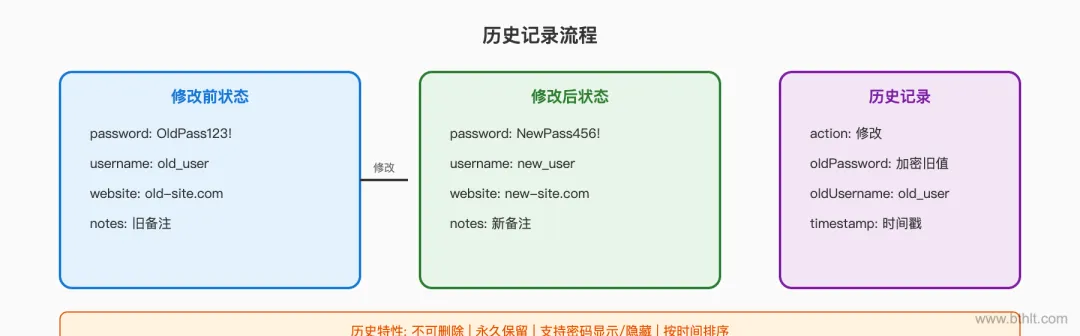 所有密码修改都会自动记录历史,支持查看和恢复旧值。历史记录采用不可删除设计,确保审计完整性: