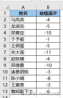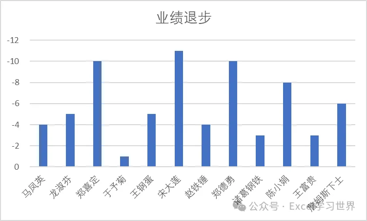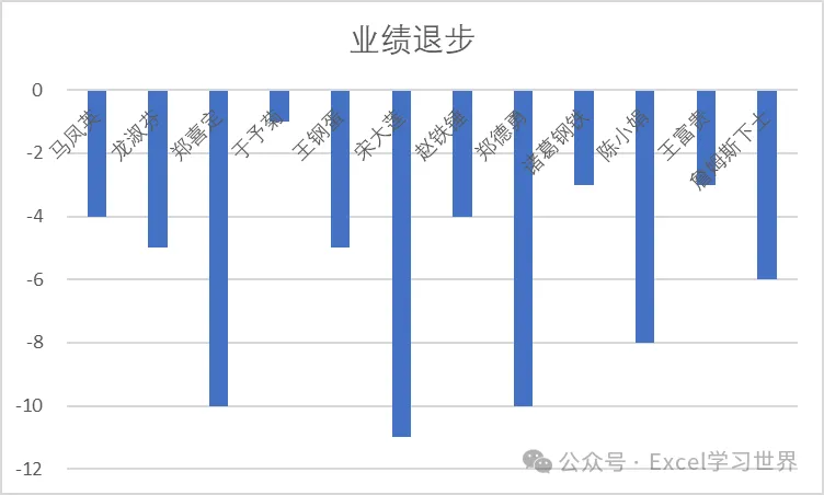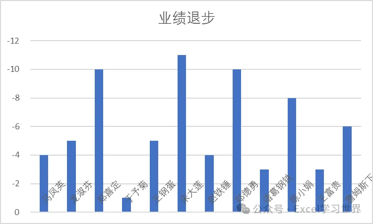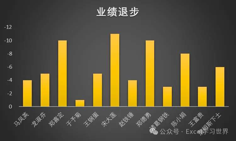 下图 1 是公司里所有业绩退步的绩效表,如果将其制作成柱形图,默认会像下图 2 这样,负数部分在 0 轴下方,看上去怪不适应的。