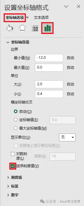3. 在右侧的“设置坐标轴格式”区域选择“坐标轴选项”–>“坐标轴选项”–> 勾选“逆序刻度值”